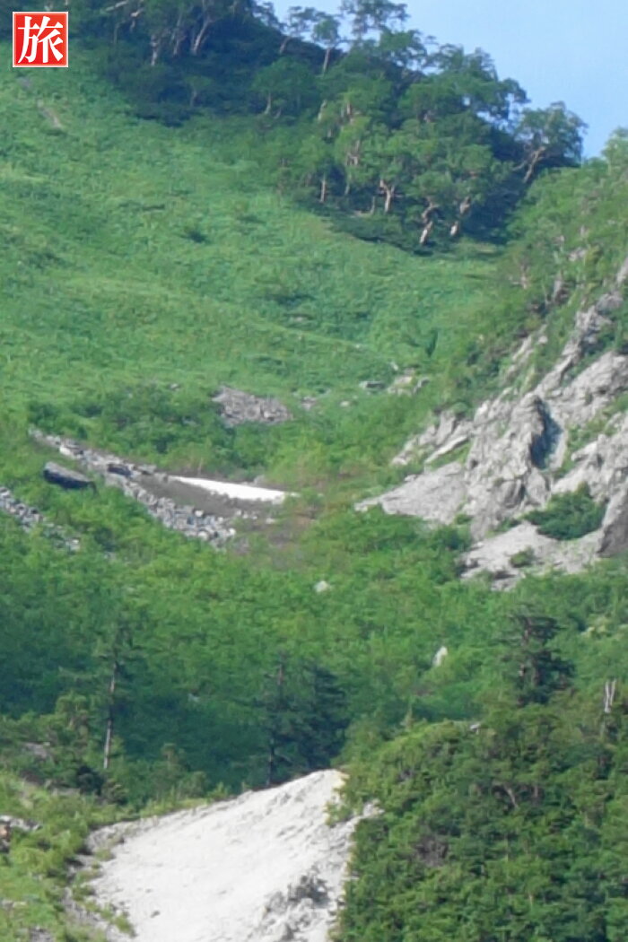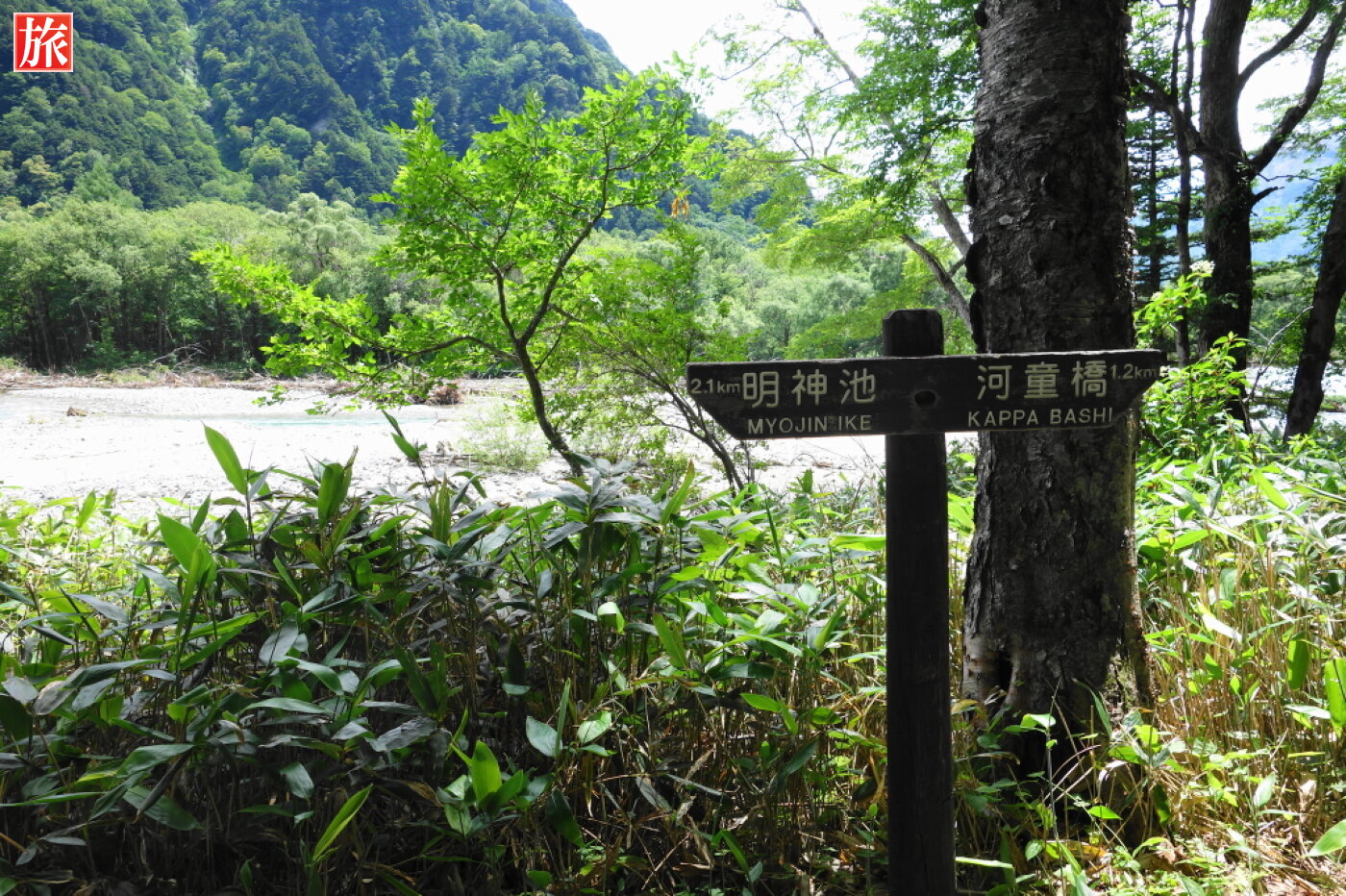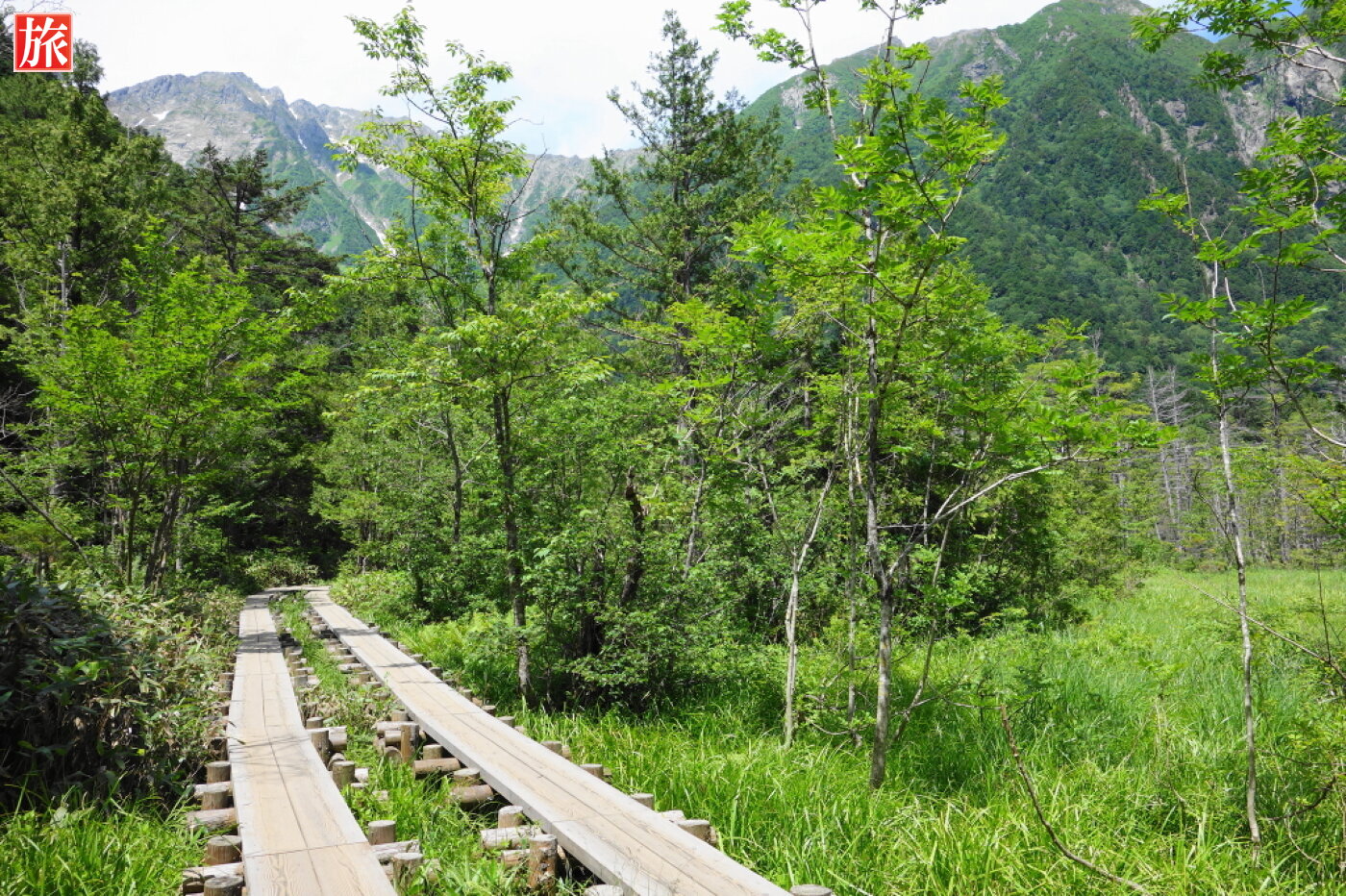 ホテル白樺荘脇から梓川右岸沿いを上流へと歩く河童橋から明神までの道。湿原などには木道が整備され、歩きやすい。上高地の自然を気軽に満喫でき、サワラ・ケショウヤナギなどの茂る原生林の木の間に明神岳、焼岳を眺望できる。