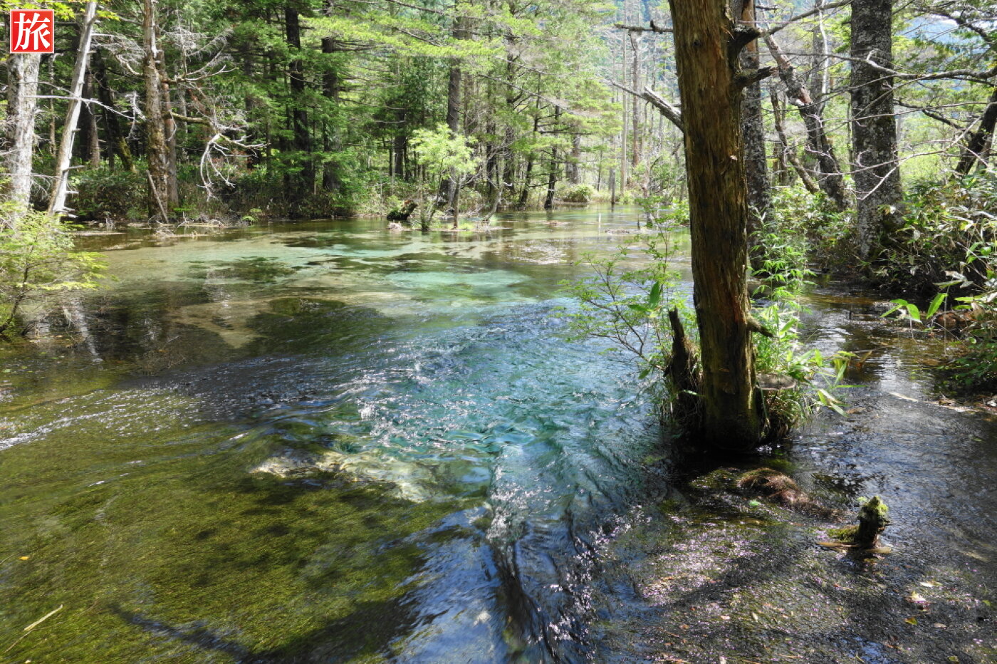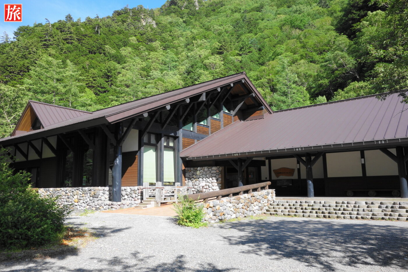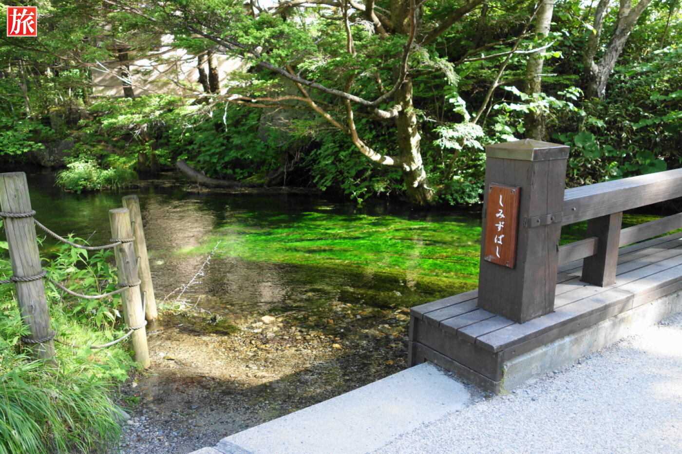 情報基地の上高地ビジターセンターです。河童橋の上流に位置する「しみずばし」。六百山の麓から湧き出た豊富な水が、梓川に流れ込む 透明度抜群の清流、清水川。上高地の飲用水源として利用されています。