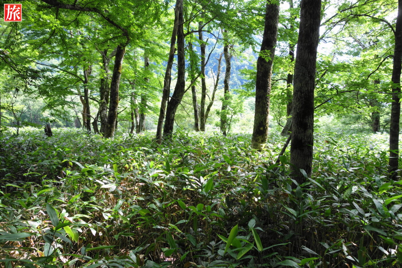 木道と清流。熊笹(クマザサ)が群生しています。明神池まであと2.1km地点です。