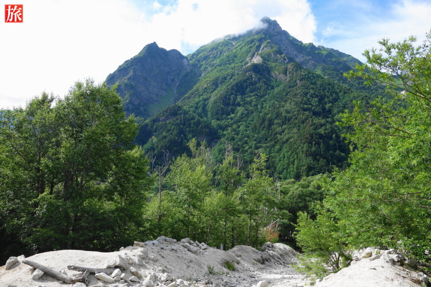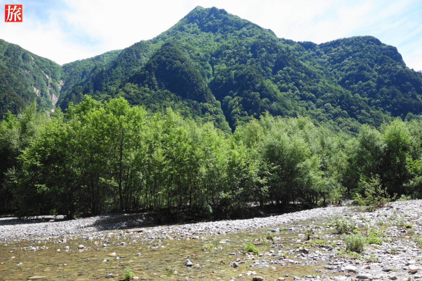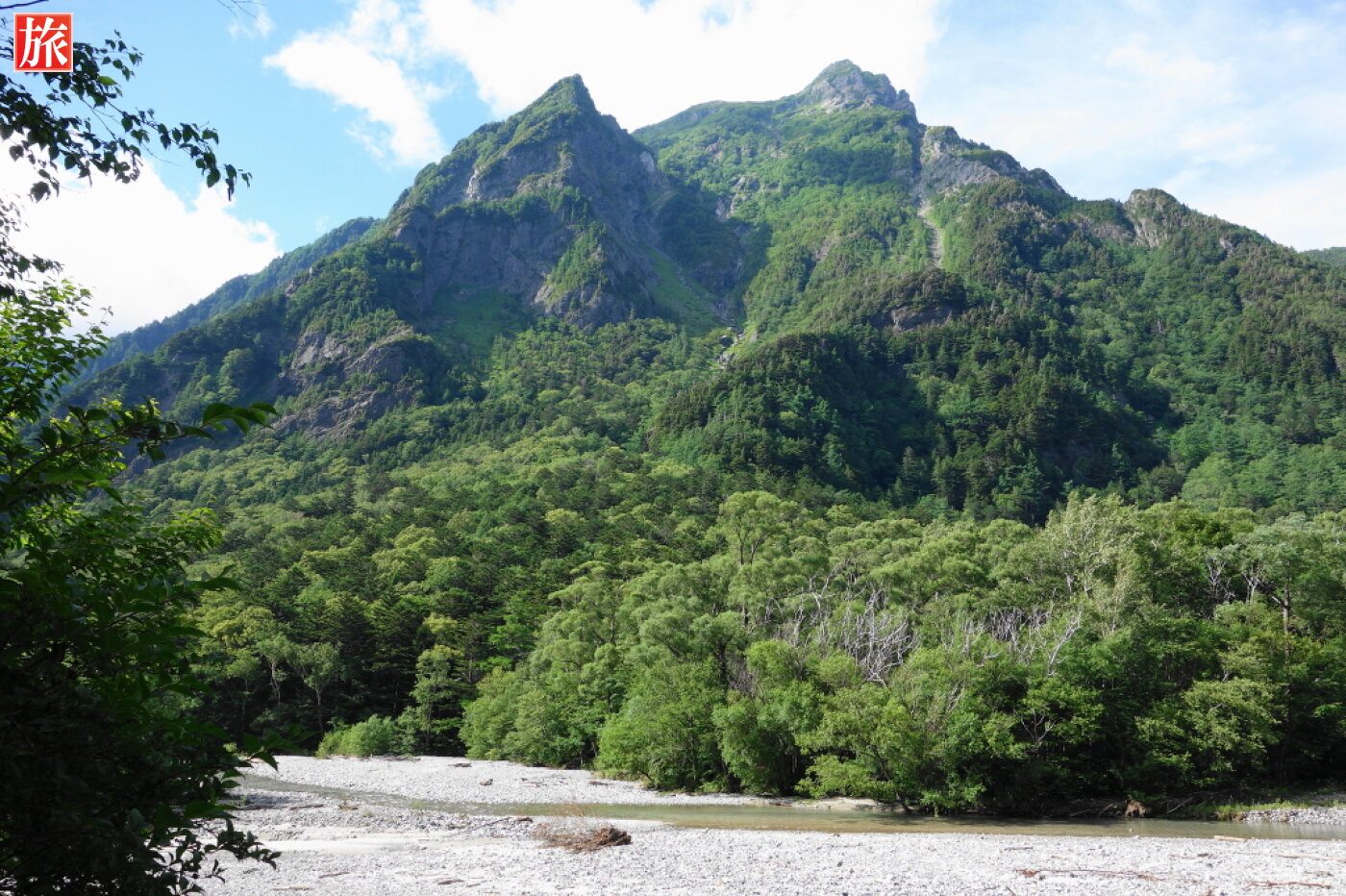 梓川の下流方向には焼岳(標高2455m)が見えます。梓川の対岸には六百山(標高2470m)が見えます。焼岳は北アルプス唯一の活火山です。