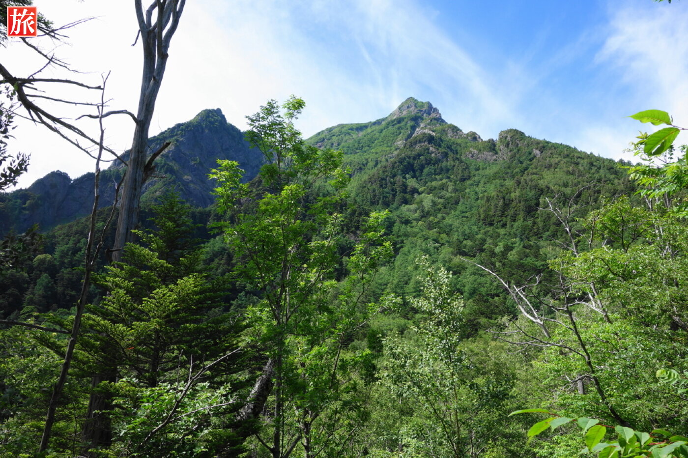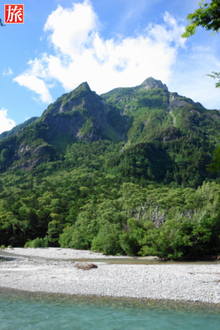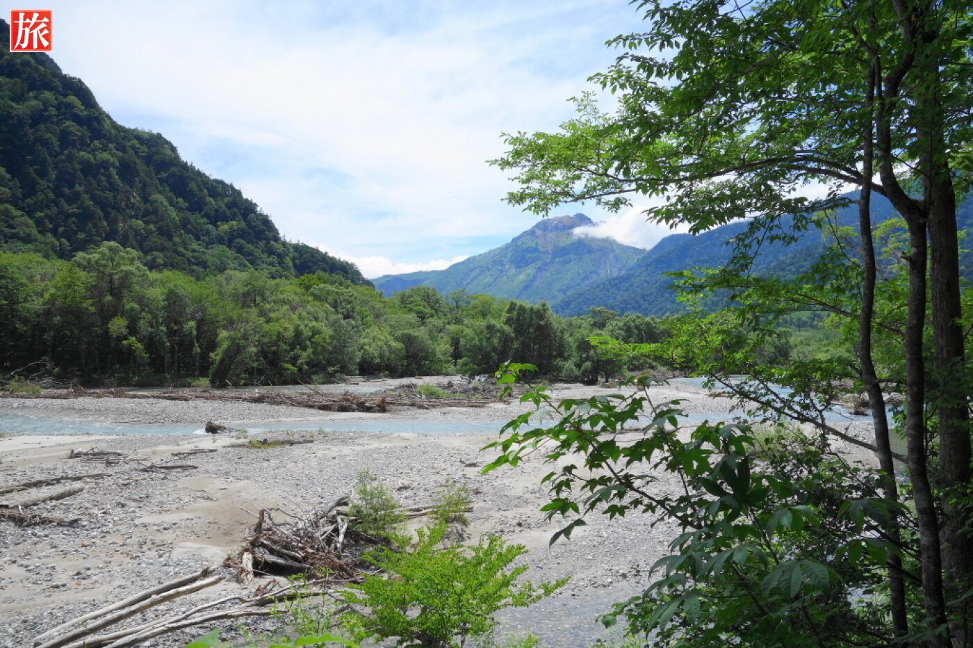 梓川の下流方向には焼岳(標高2455m)が見えます。梓川の対岸には六百山(標高2470m)が見えます。焼岳は北アルプス唯一の活火山です。