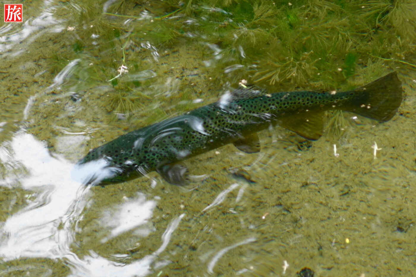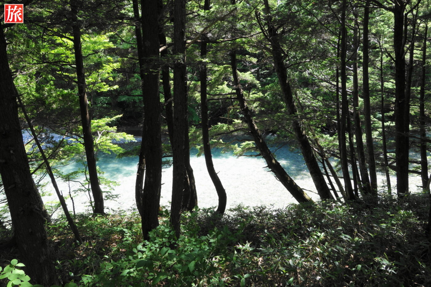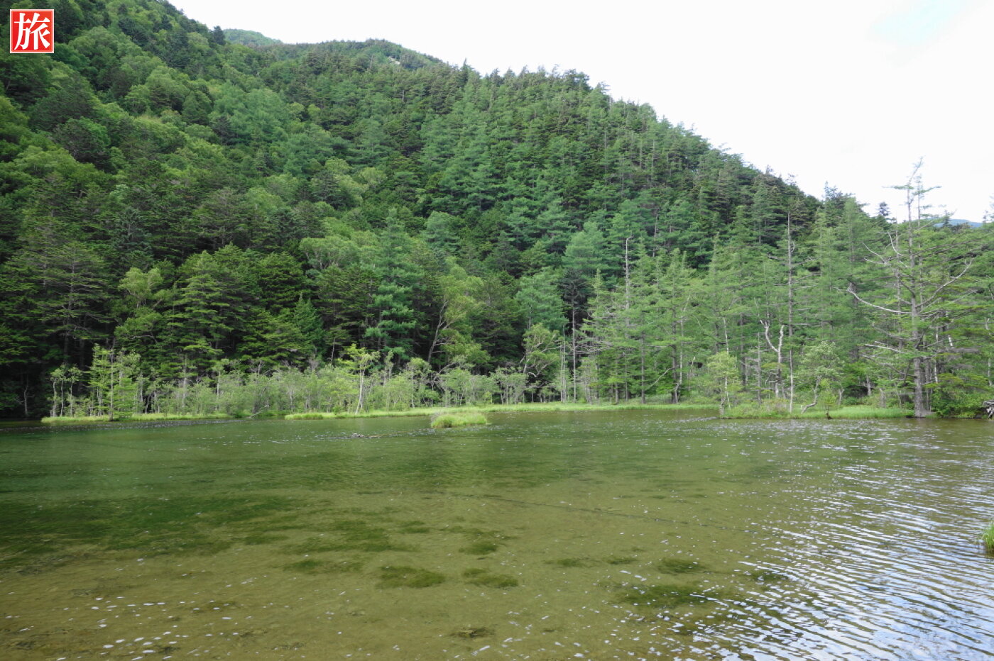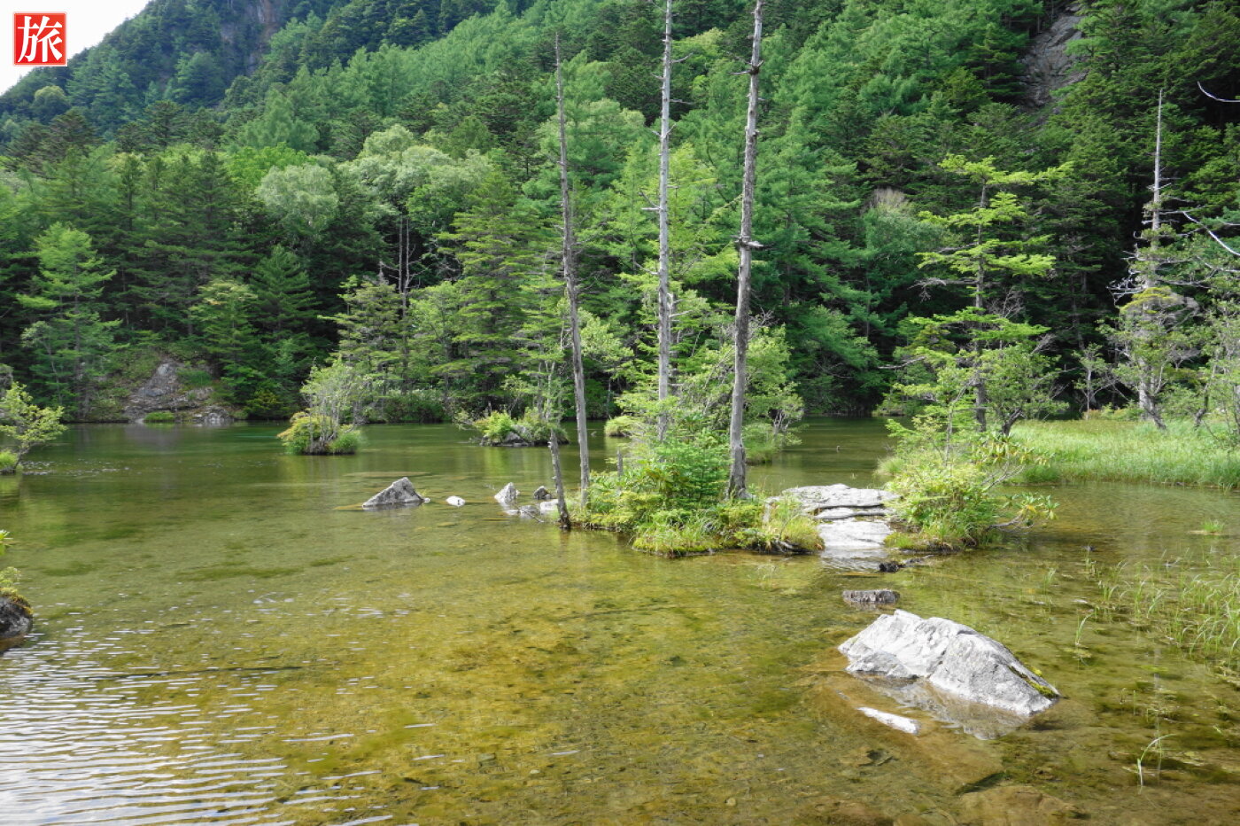イワナ?マス?が泳いでいました。木々の緑が美しい明神一之池。※動植物保護のために釣りは禁止とのことです。明神ニ之池です。所々に岩や小さな島が点在しています。