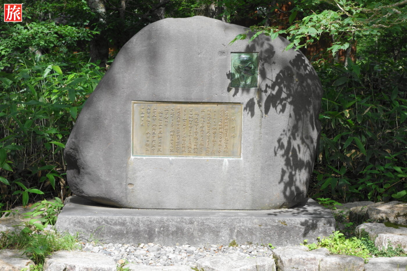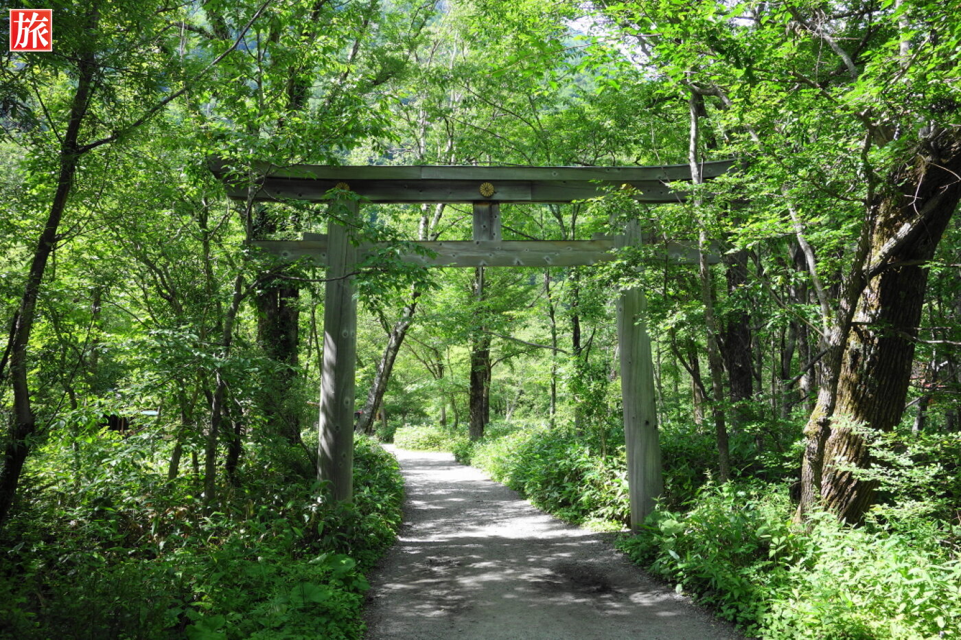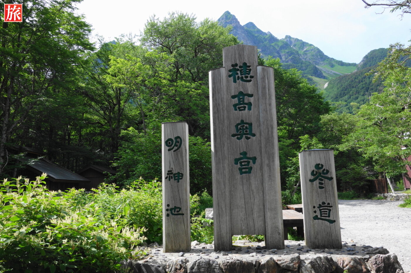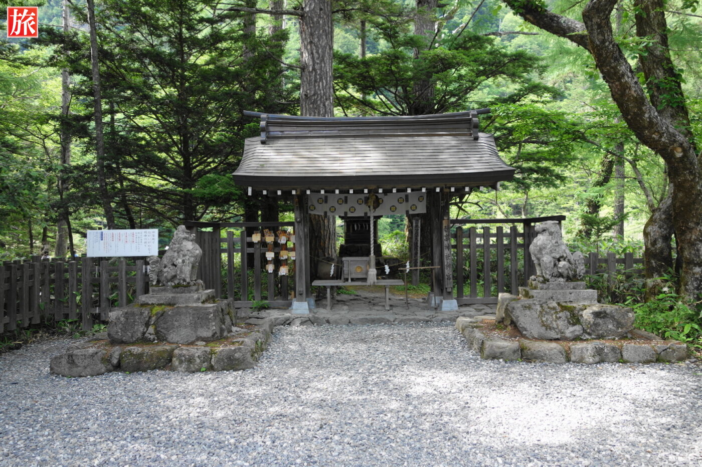 上流には明神橋が架かっています。穂高神社奥宮に立ち寄りました。穂高神社奥宮の鳥居。上條嘉門次レリーフ(石碑)。