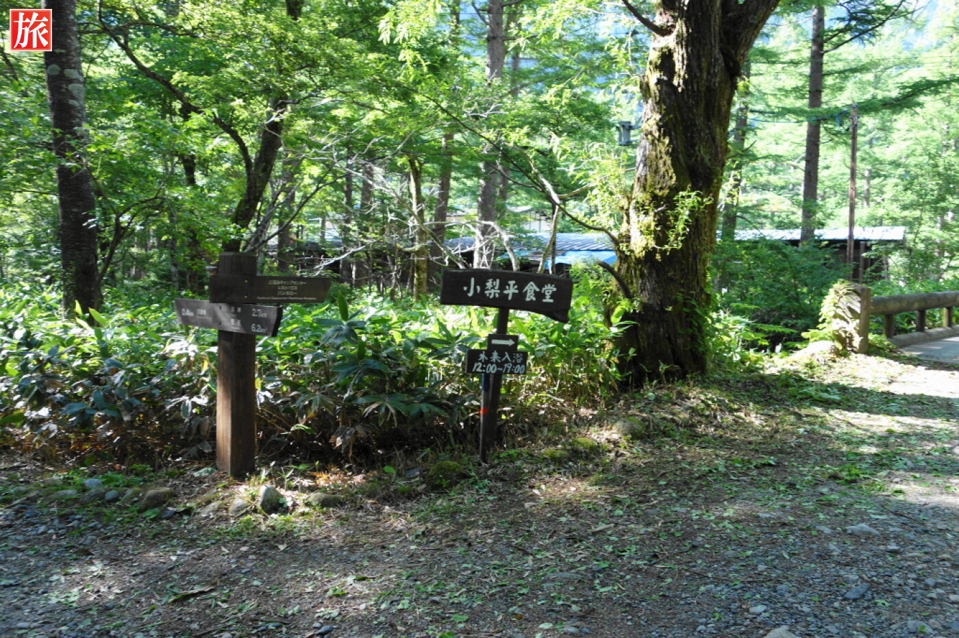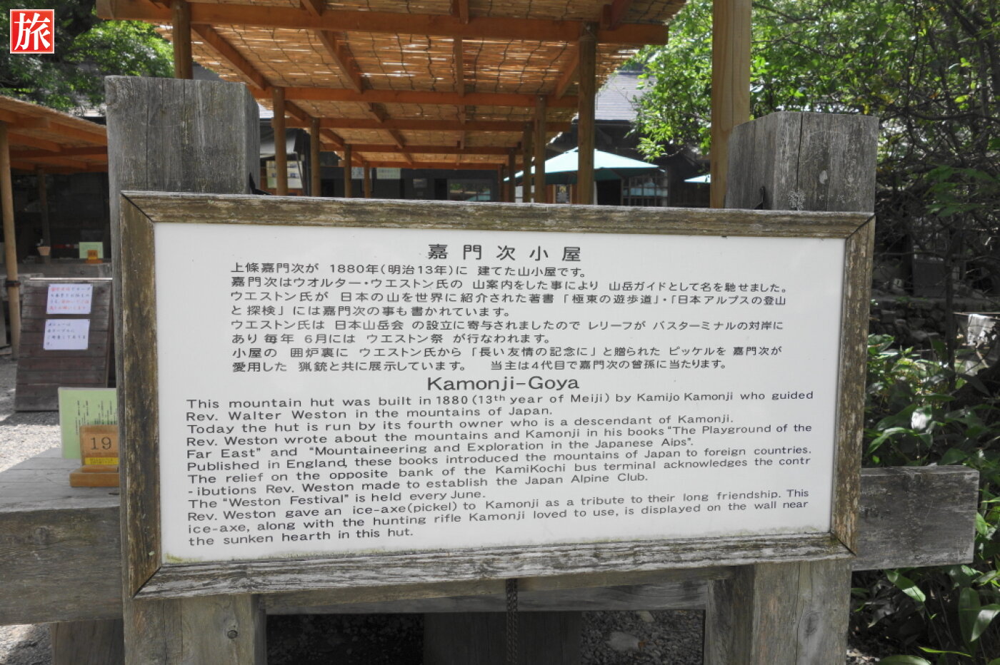 嘉門次小屋。明治時代にウェストンを上高地に案内した名ガイド上條嘉門次の山小屋です。嘉門次小屋の案内板。