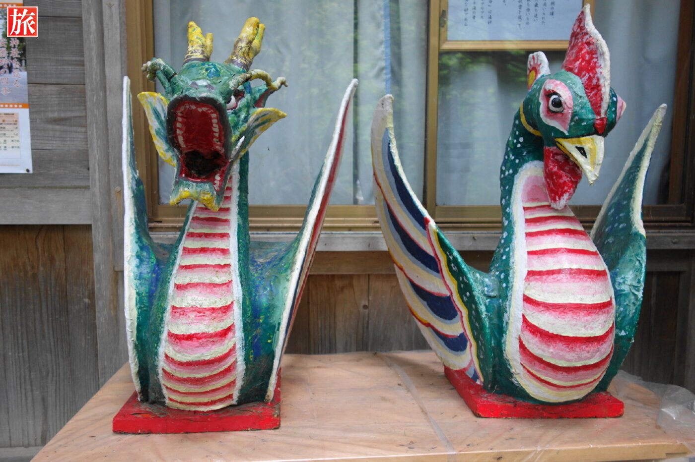 参拝者の休憩所。参拝者窓口です。拝観料250円が必要です。神社の脇に穂高神社例大祭(お船祭り)に使われる龍頭鷁首(りゅうとうげきしゅ)が置かれていました。