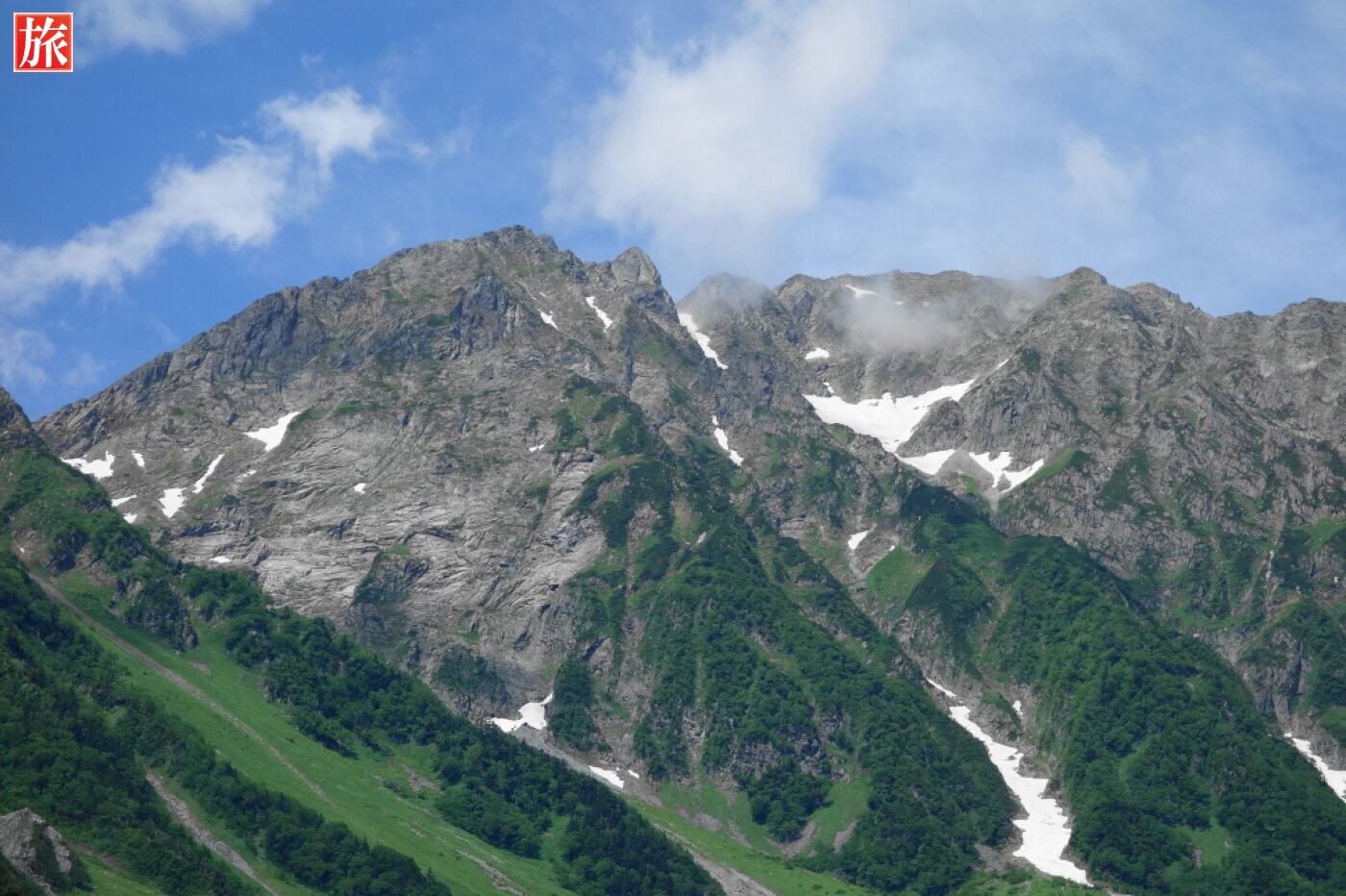 穂高岳(左手前から・西穂高岳・間ノ岳・天狗の頭・ジャンダルム・奥穂高岳・岳沢・前穂高岳・明神岳)岳沢カールの雪渓も見えます。