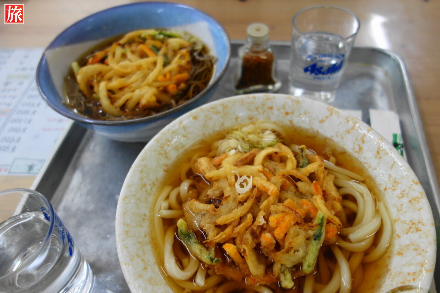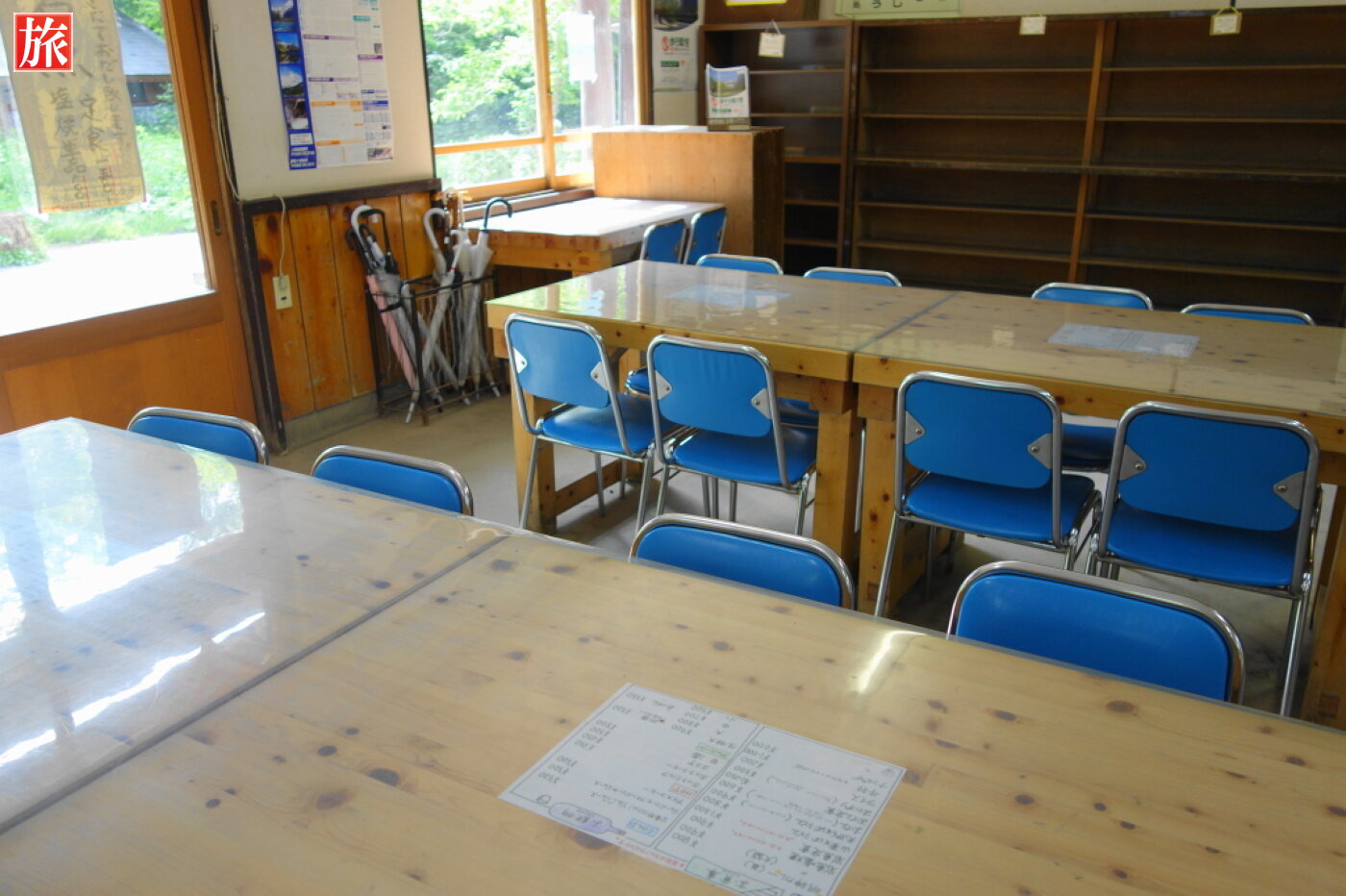 宿泊受付のカウンター、食事もここで注文しました。明神館 テーブルと椅子。天ぷらうどんと天ぷらそば。各800円でした。他にも岩魚塩焼定食1500円などのメニューもありました。