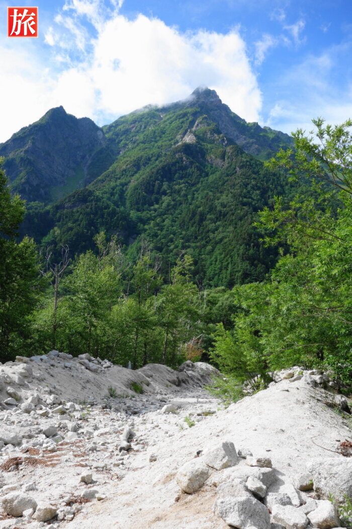 西穂高岳・間ノ岳・天狗の頭。上高地のベストスポットです。自然探勝路を進んでいきます。