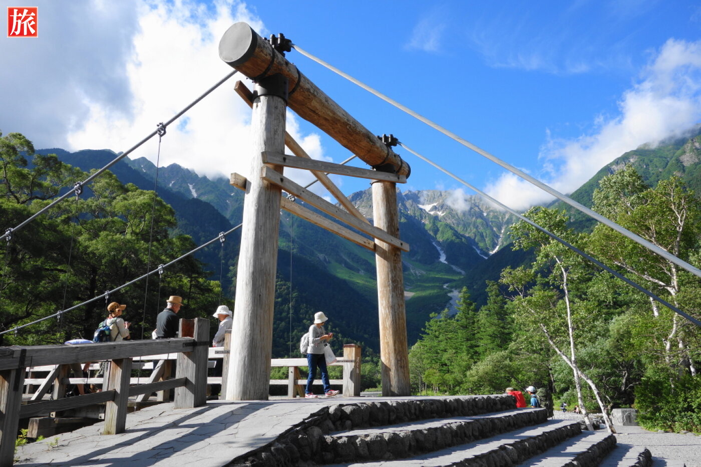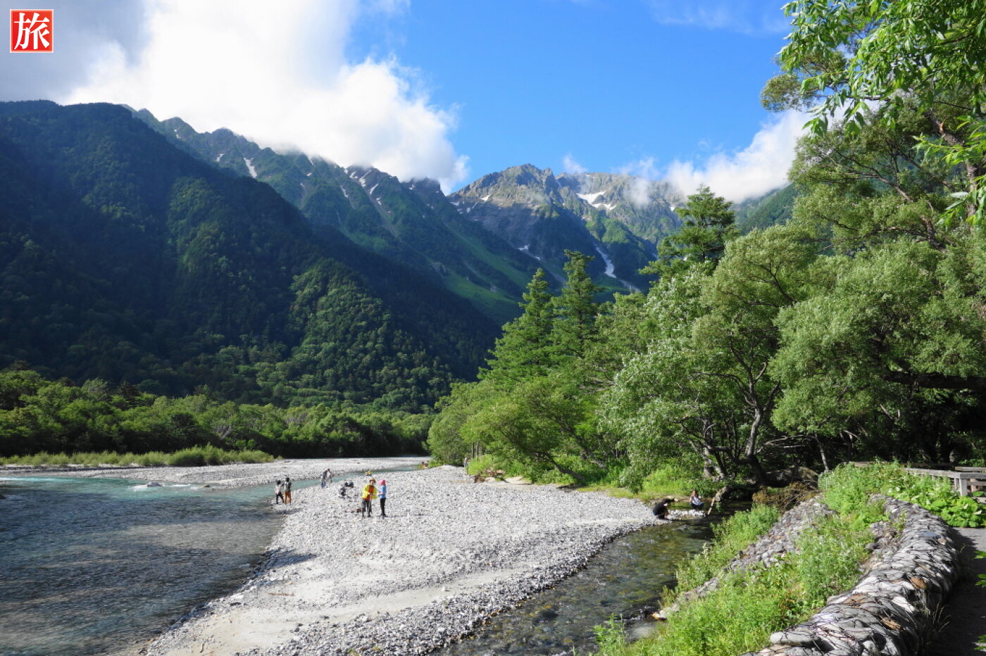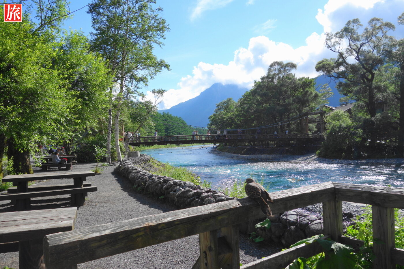 河童橋を渡スタートします。少し進んだ所に穂高岳を望む絶景スポットがあります。