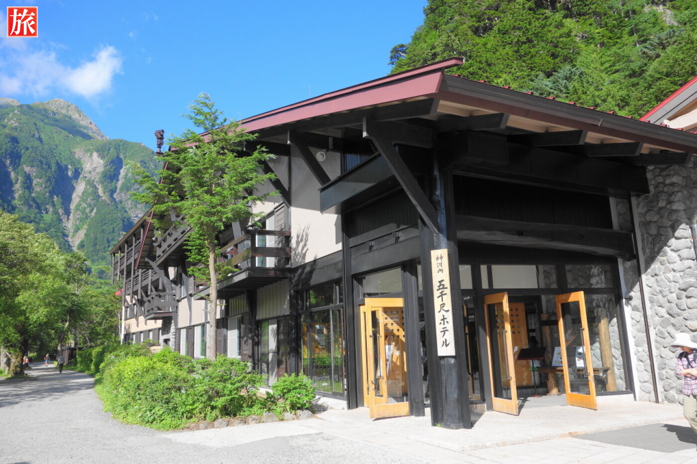 河童橋と焼岳を望む。穂高岳を望む。河童橋の近くにある五千尺ホテルです。夕食はフランス料理のフルコースも楽しめます。