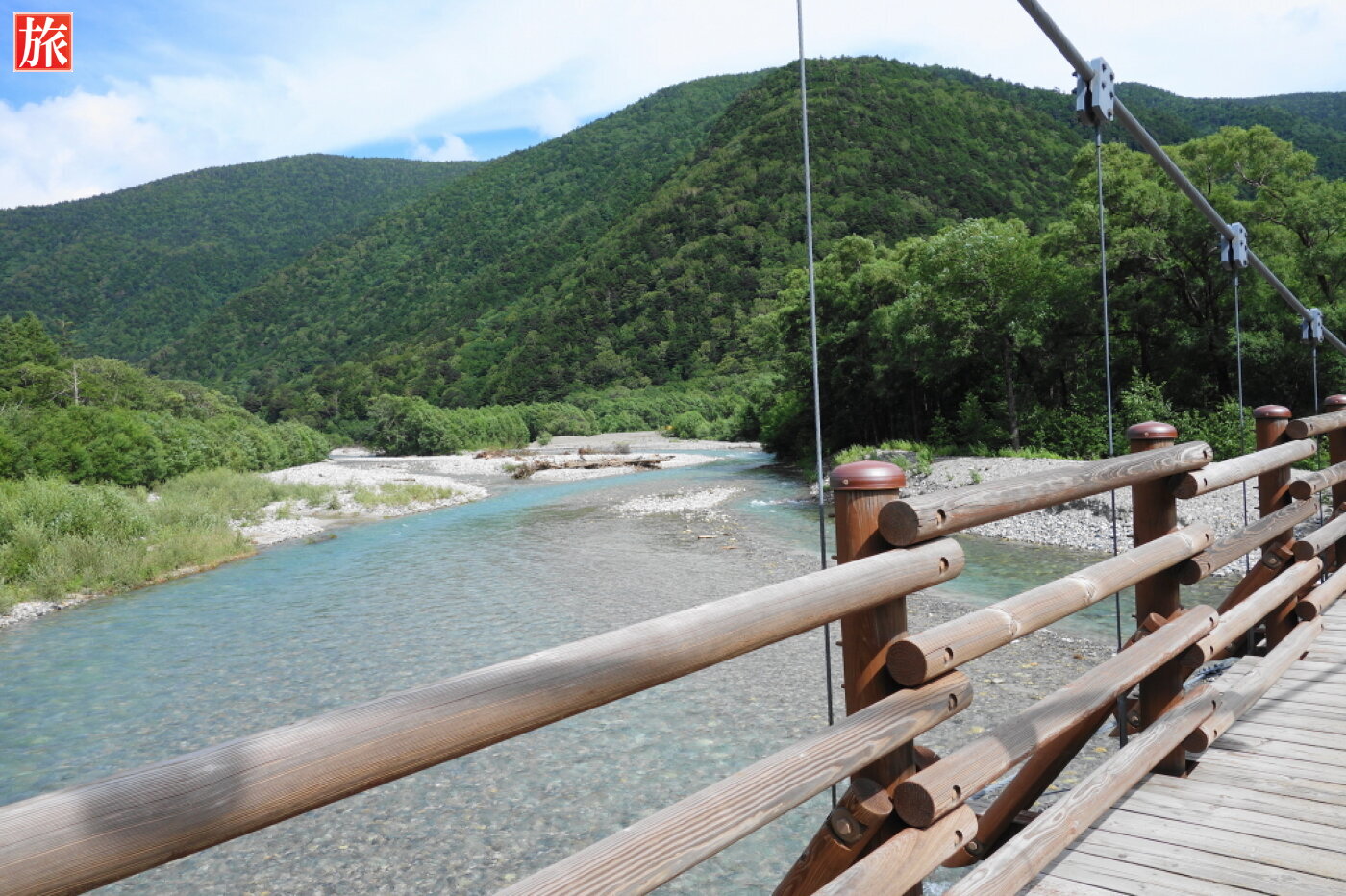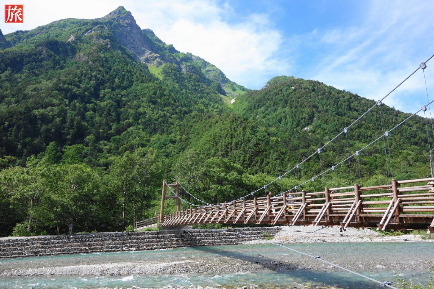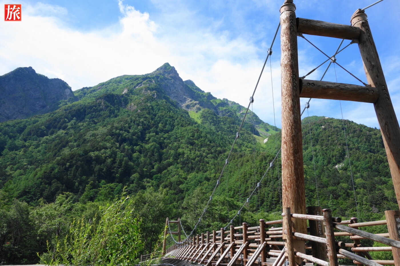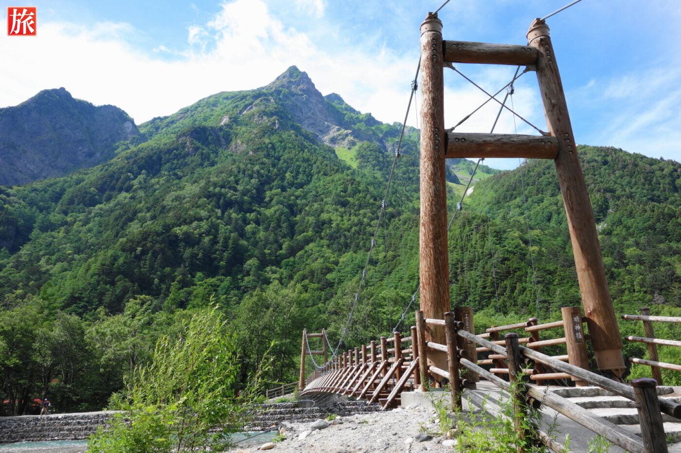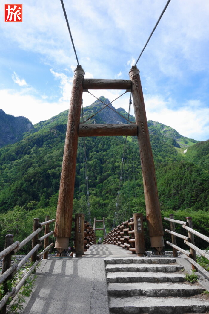橋の上から眺める、標高2931mの明神岳の姿は一見の価値有り。