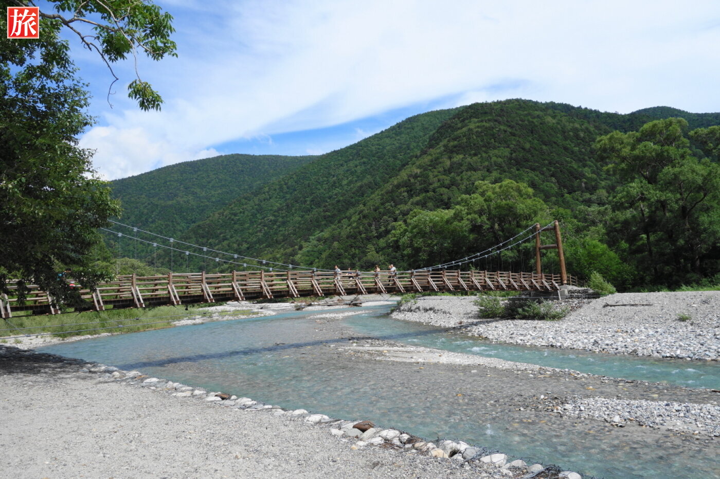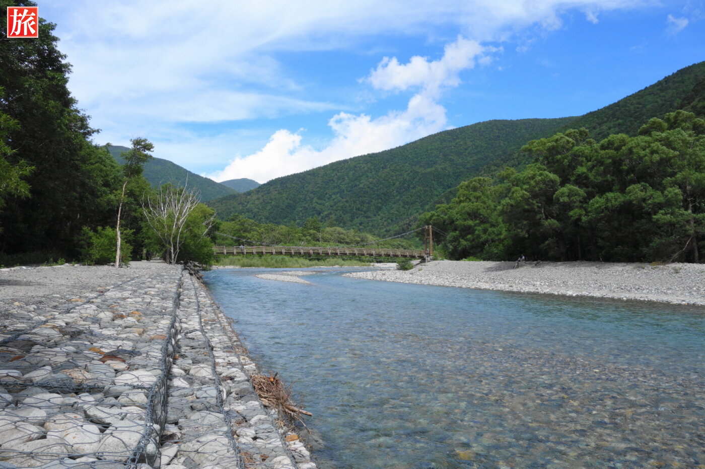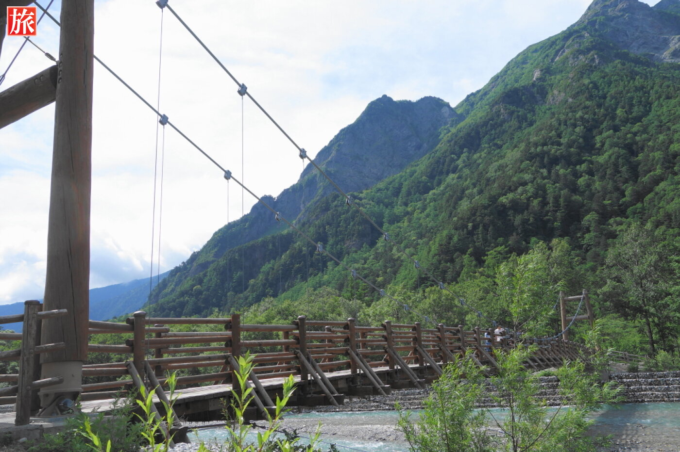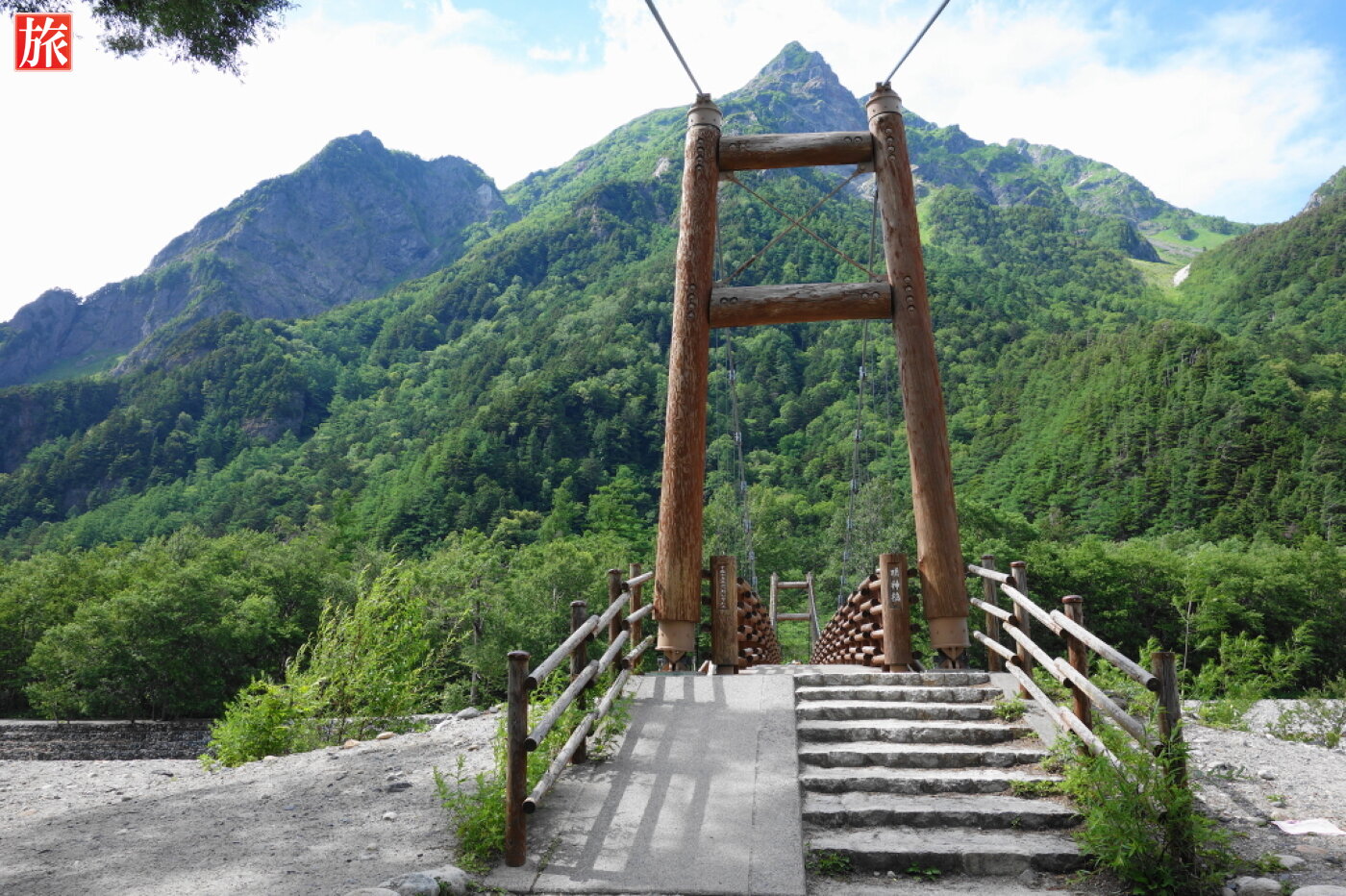 橋の上から眺める、標高2931mの明神岳の姿は一見の価値有り。