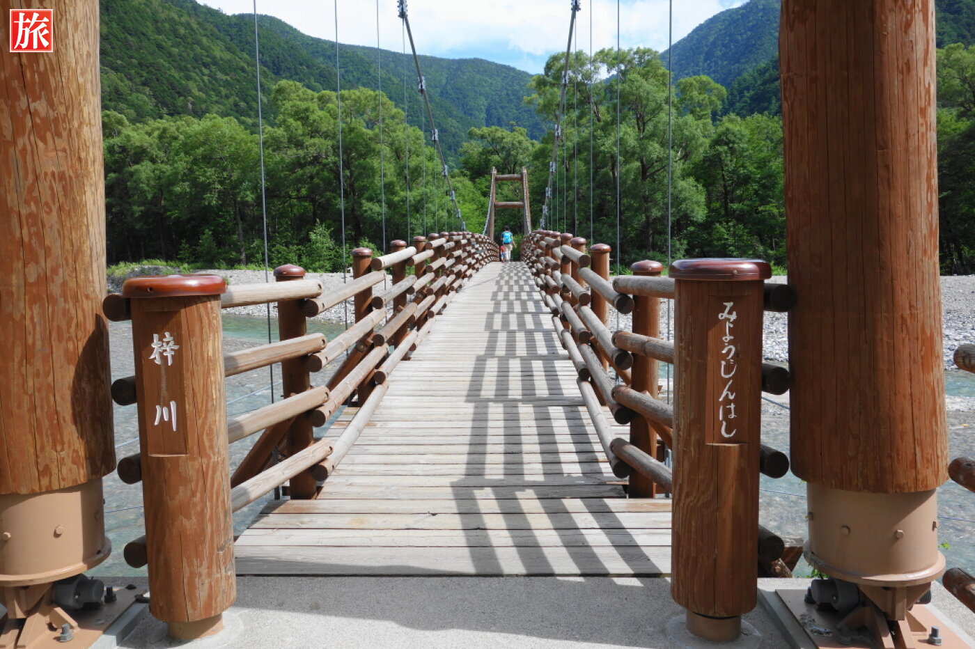 散策ルート > 河童橋 > 穂高神社奥宮 > 明神池 > 明神橋 > 復路:梓川左岸明神岳の麓にある吊り橋で、2003年に架け替えられました。見事に真っ正面に迫力のある明神岳全体が望める絶景ポイントです。