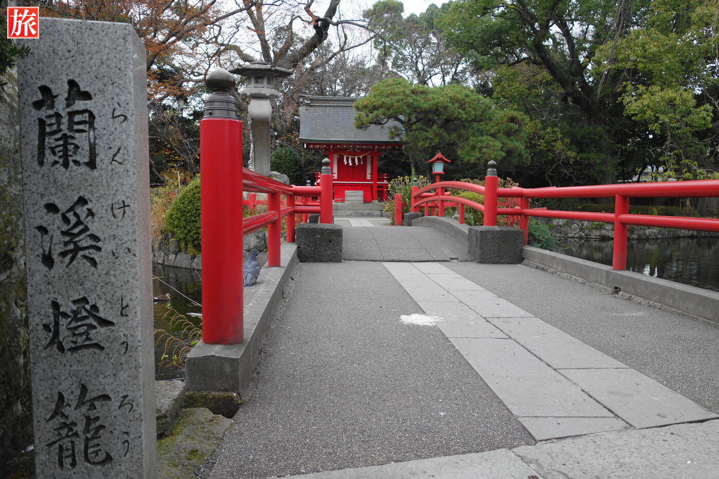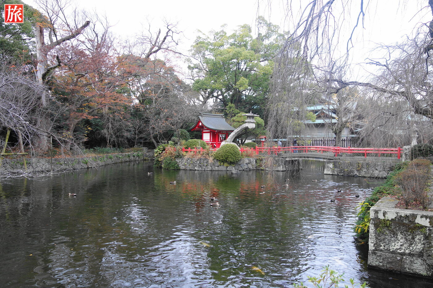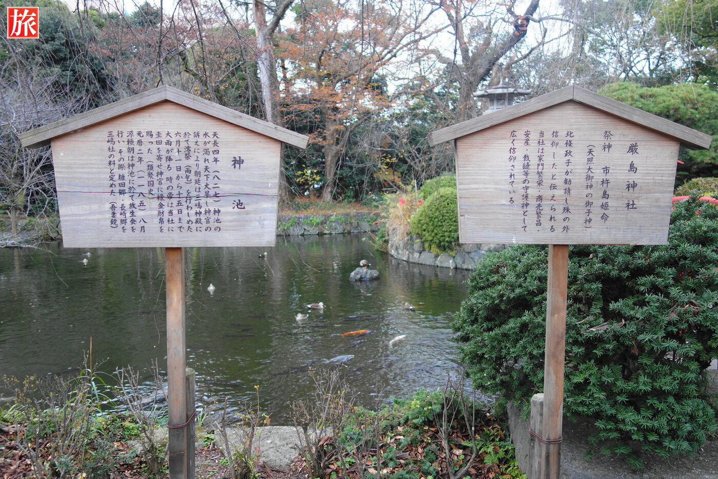 石鳥居方向を振り返った様子。神池・厳島神の説明板。総門手前の神池に浮かぶ厳島神社。この厳島神社は北条政子が信仰したと伝えられています。