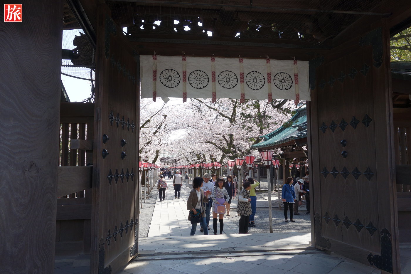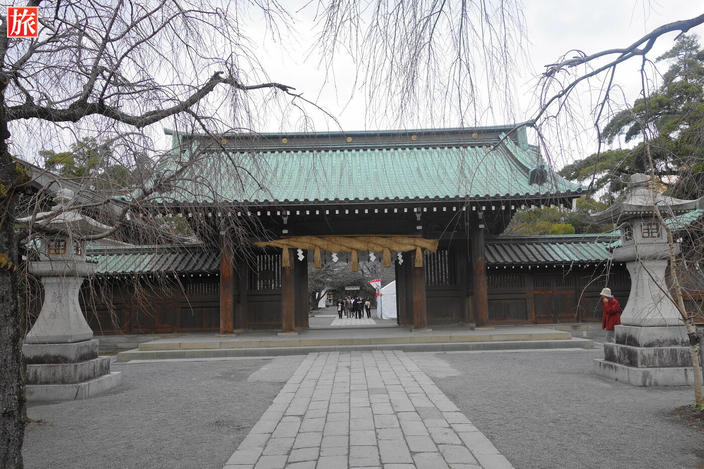 大鳥居参道を進むと左手に枝垂れ桜。総門付近の様子。総門。
