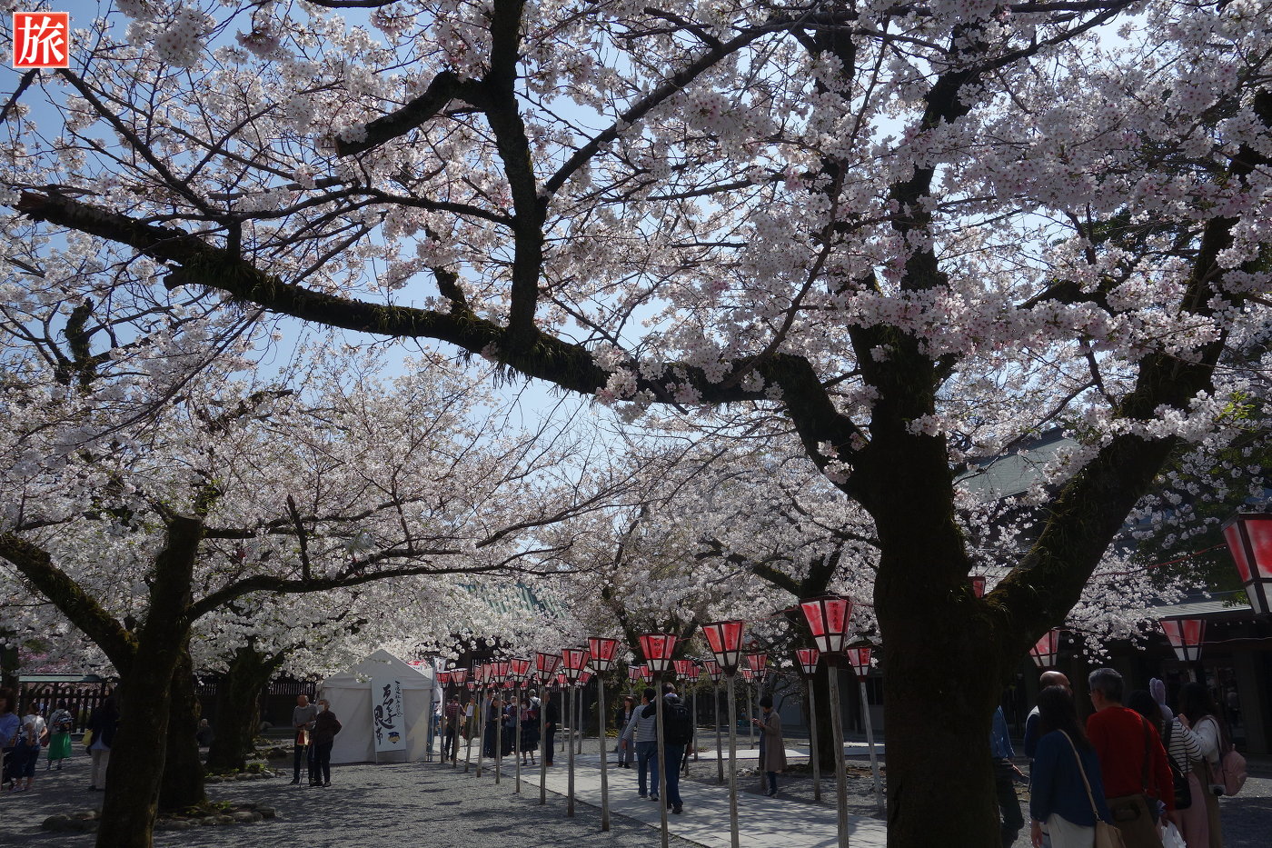 御本殿へと続く参道には約15種200本の桜が植えられています。平日にもかかわらず多くの人が訪れていました。