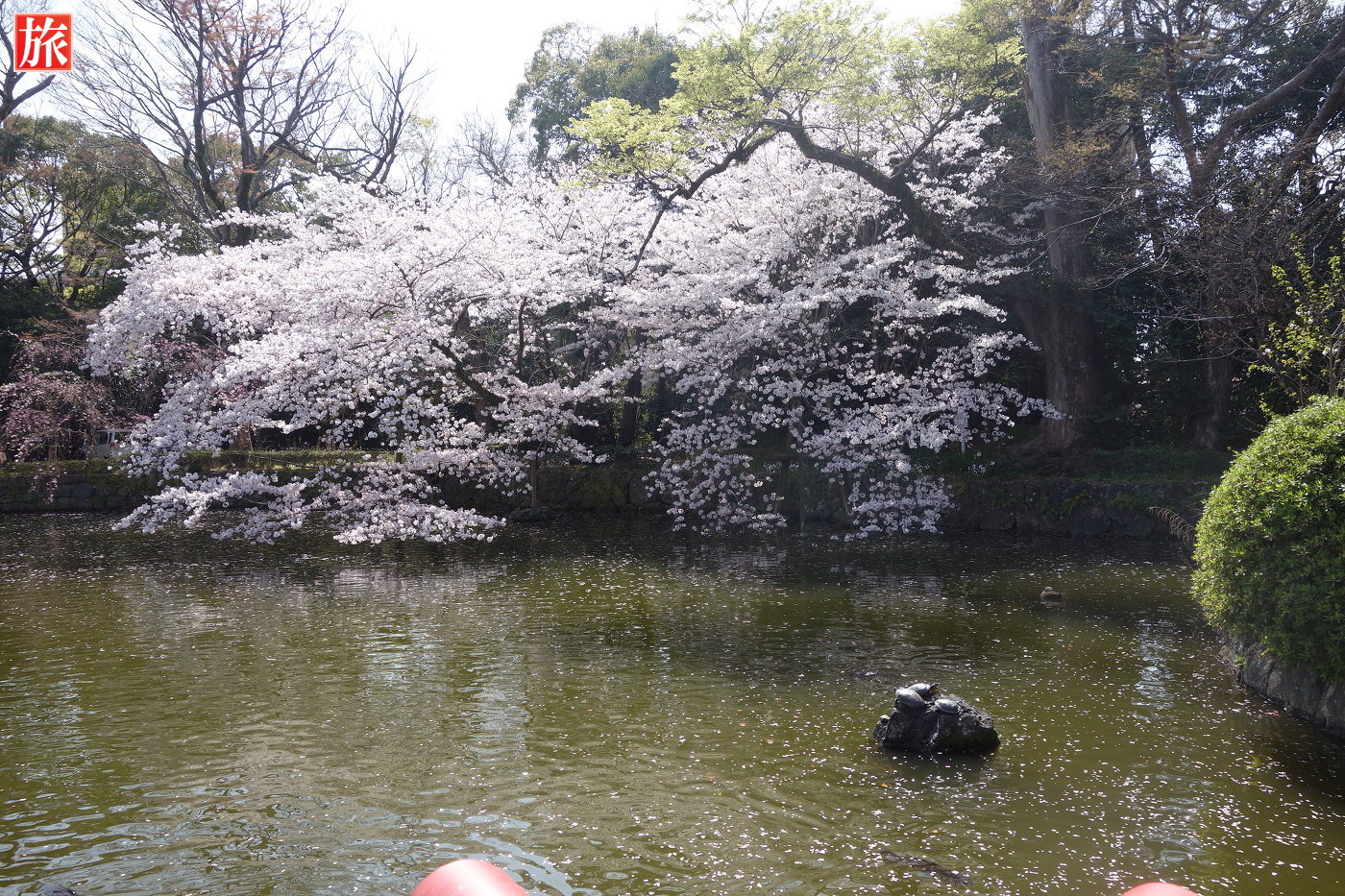 「安達藤九郎盛長 警護の跡」にあった、赤松と黒松が1本の木に生えている縁起の良い相生松。桜の木々に囲まれた神池(向かって右側)。神池(向かって左側)。