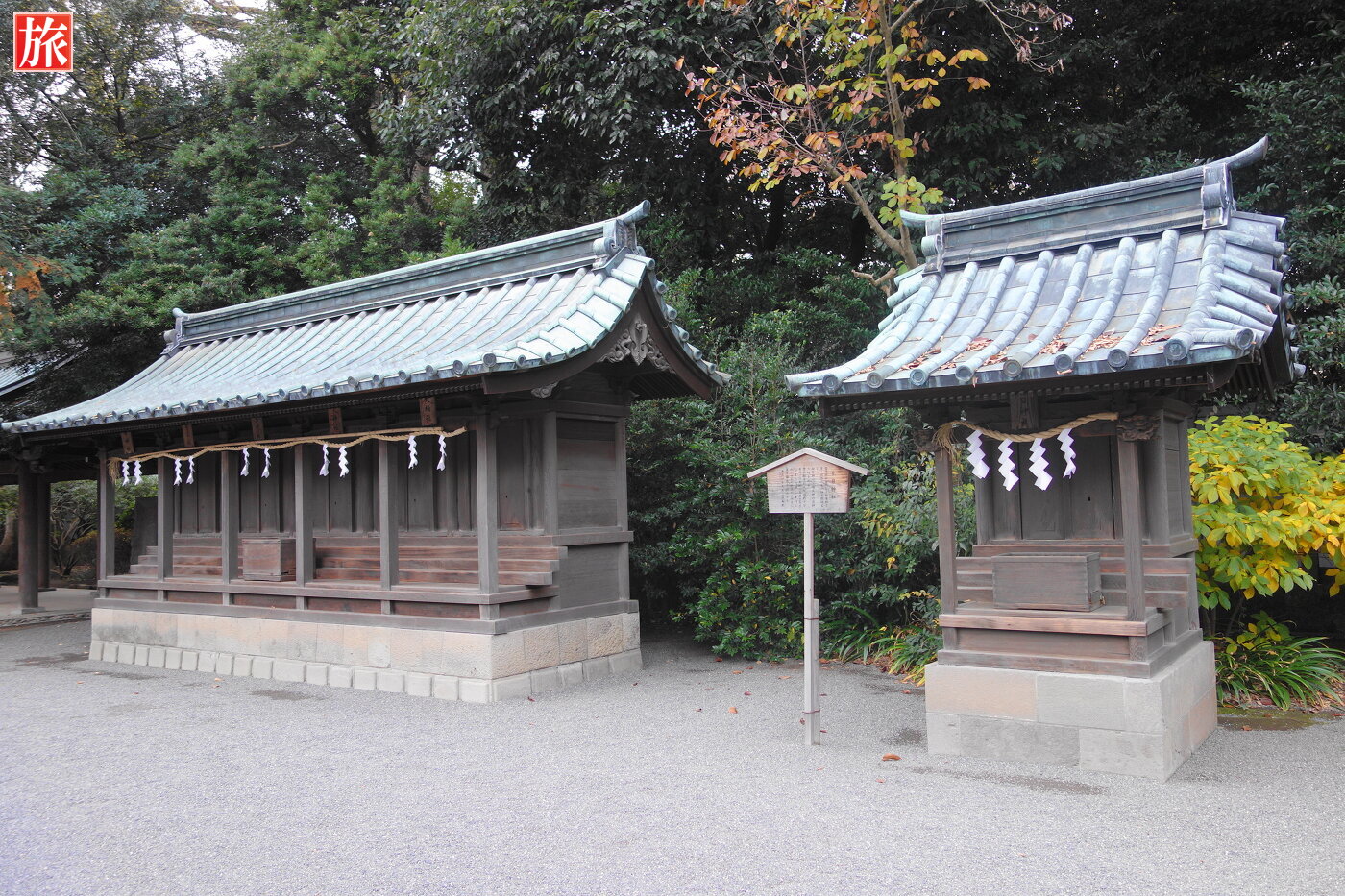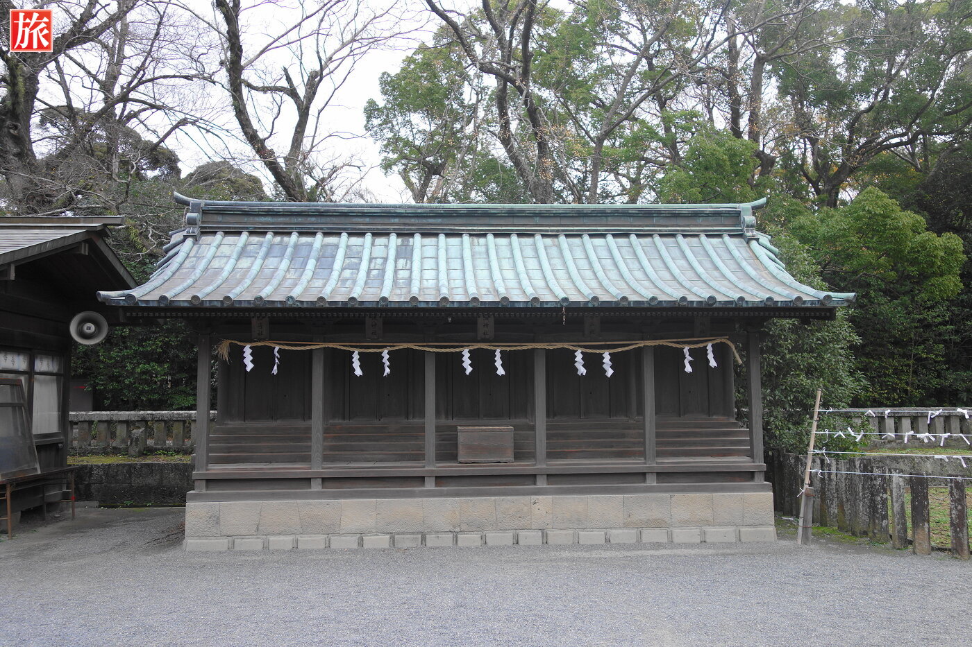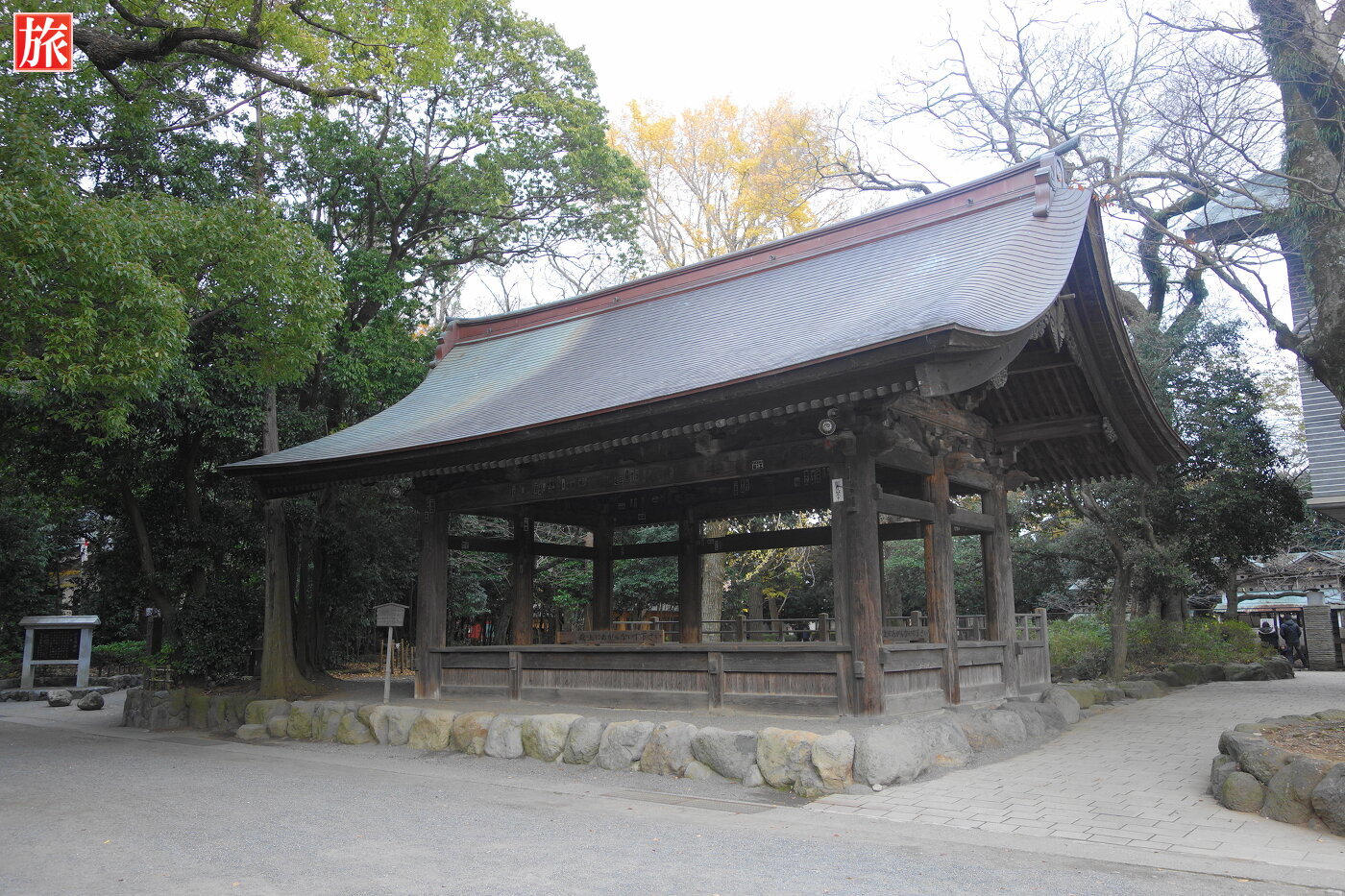 総門をくぐり左手に社務所があります。右手には宝物館。宝物館の先にある芸能殿(旧総門、昭和5年の伊豆大震災で破損したためにこちらに移築)。