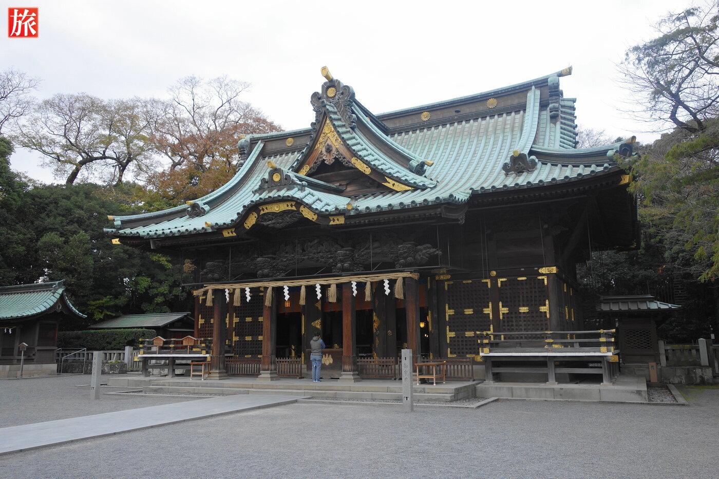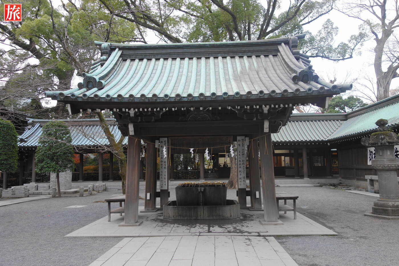 手水舎。1867年の建立の神門(しんもん)。本殿方向から見た神門。