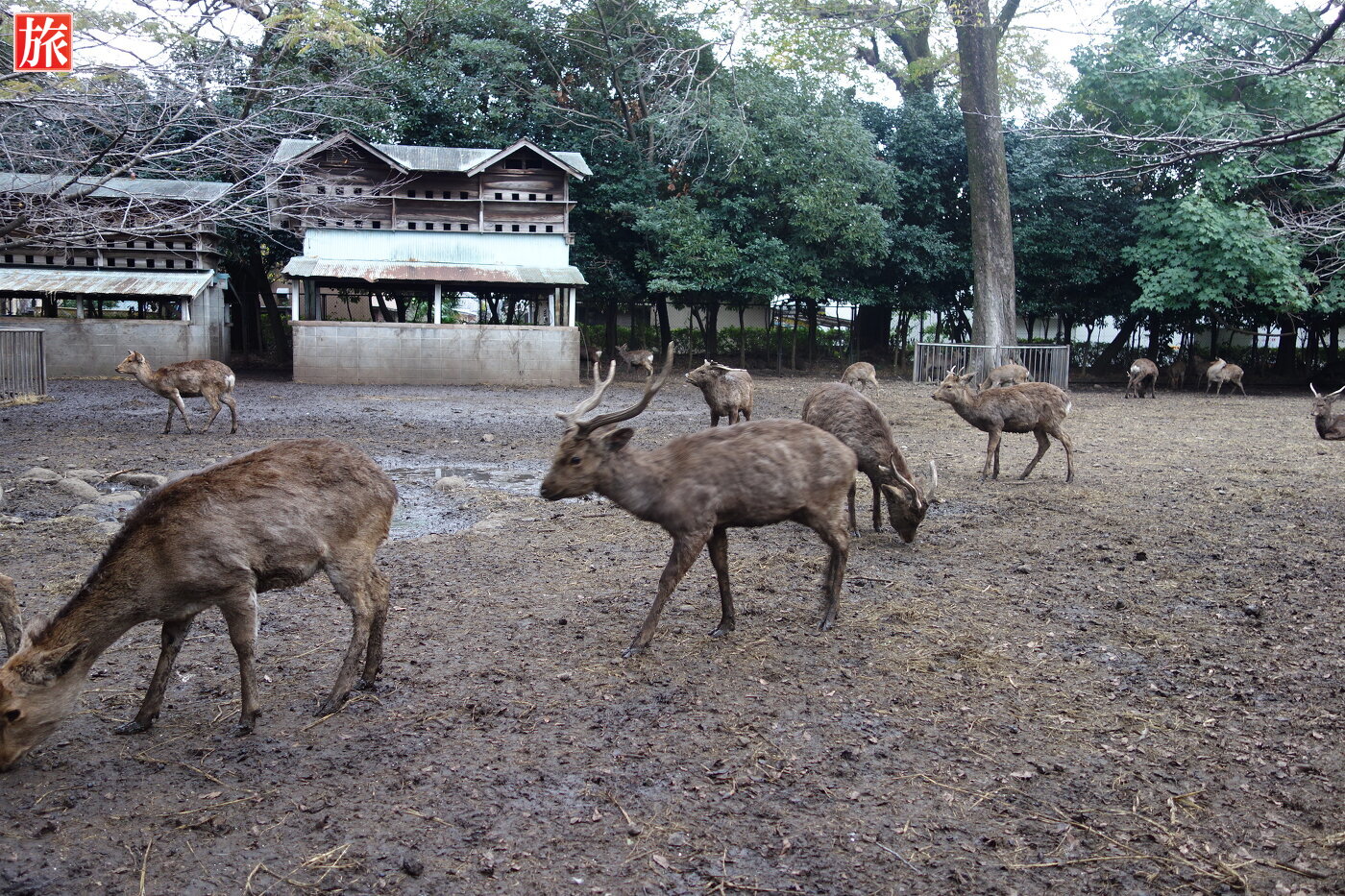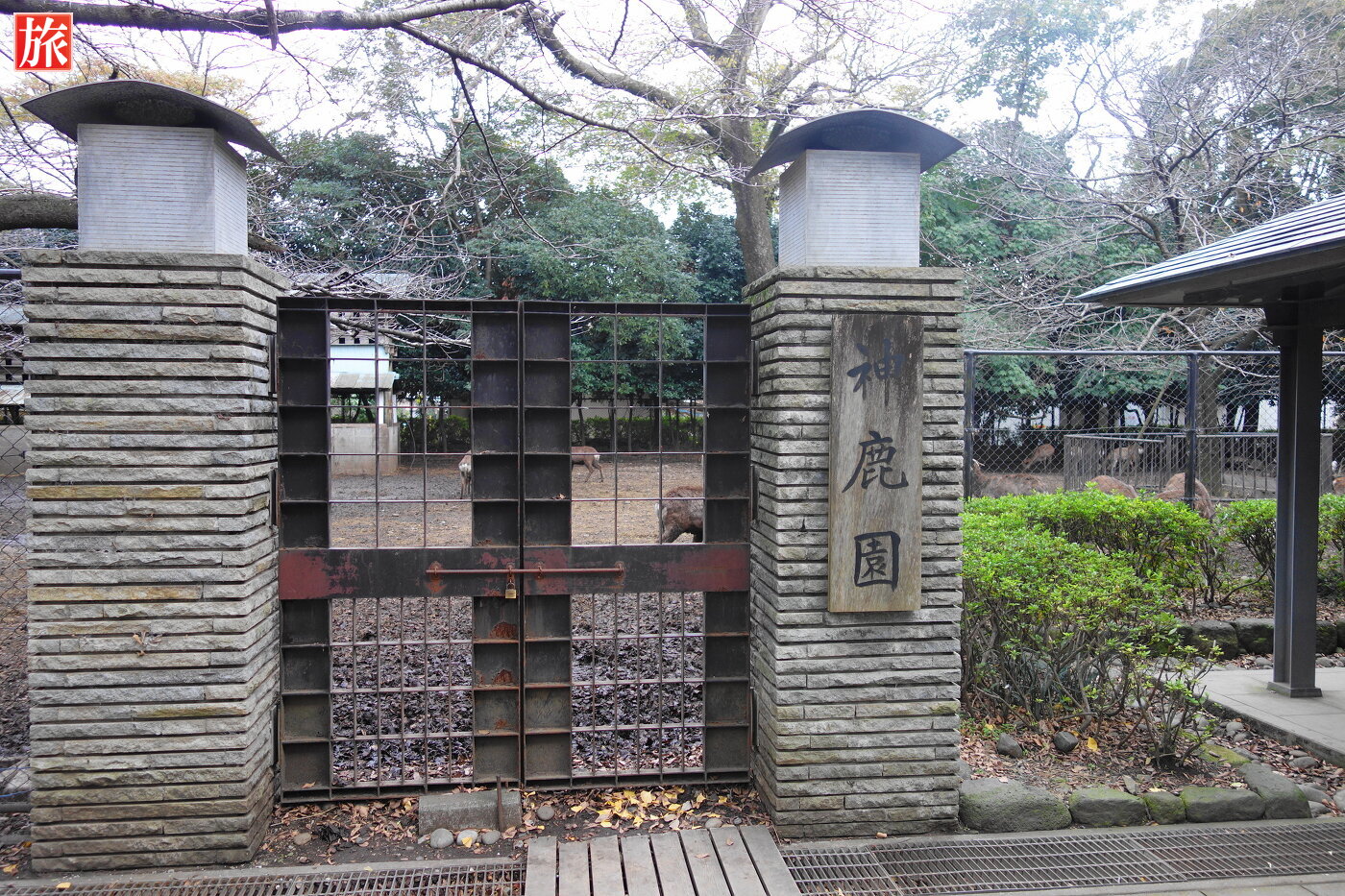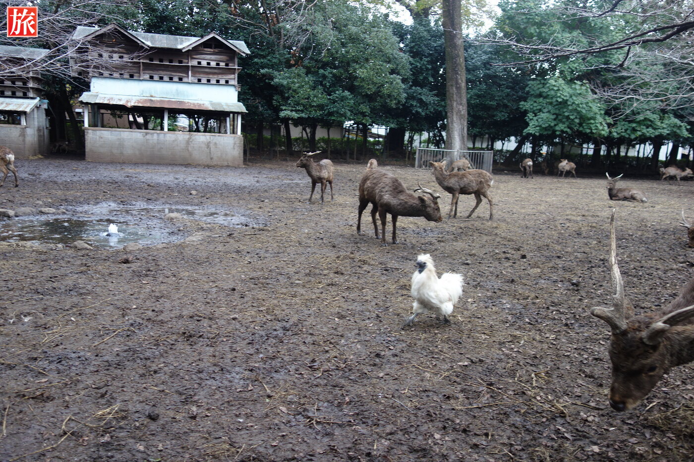 神鹿園。こちらの鹿は、大正8年(1919)奈良の春日大社から譲り受けたそうです。鹿と烏骨鶏。