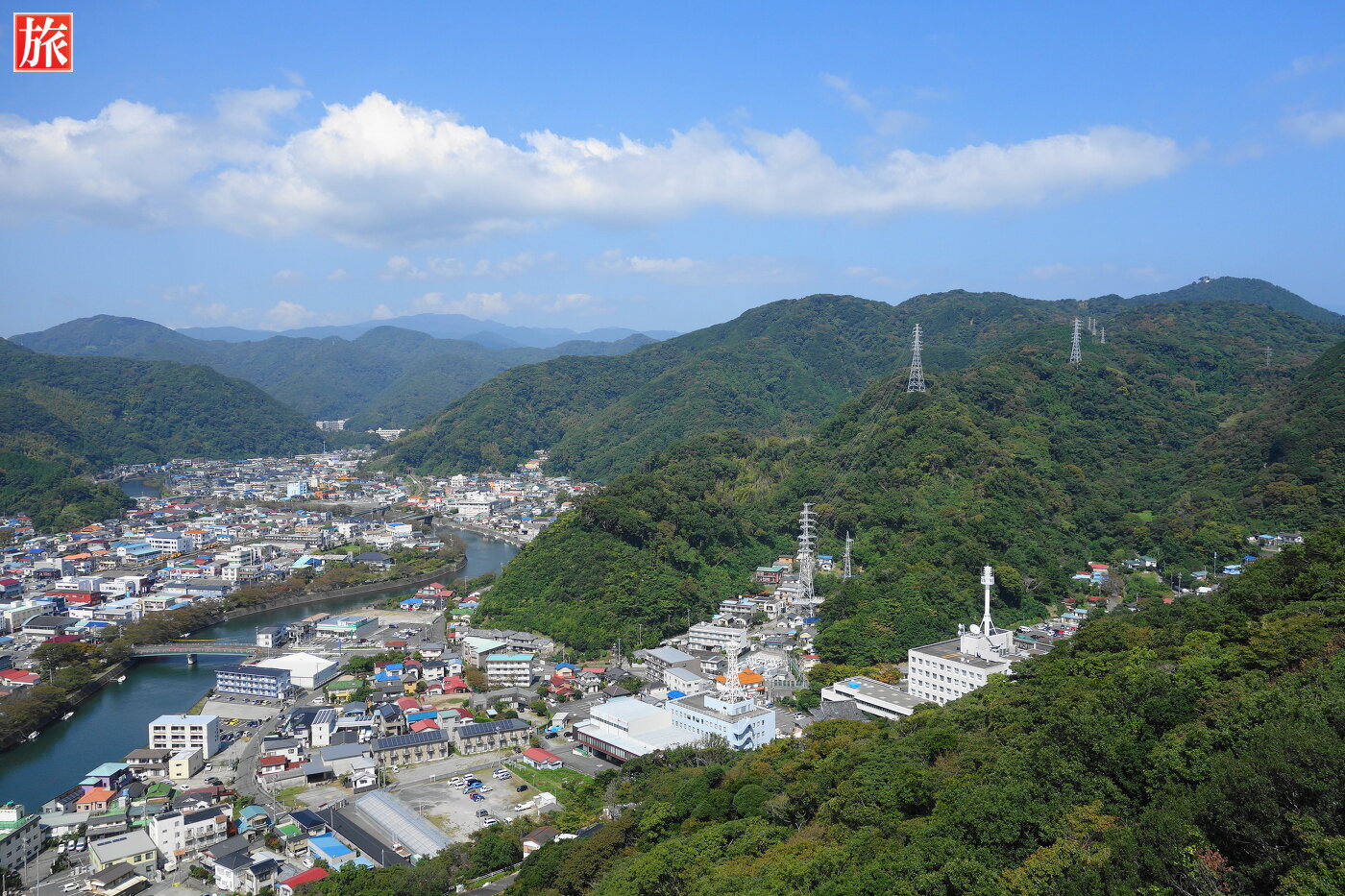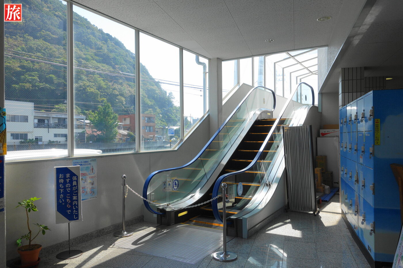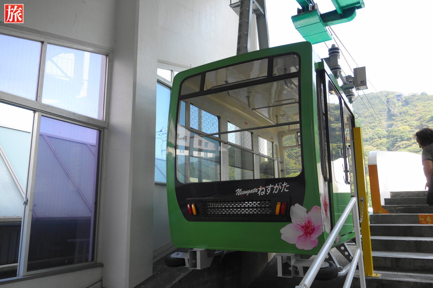 エスカレータでロープウェイ乗り場は向かいます。乗車券、大人一人往復1030円。ロープウェイ「ねすがた」に乗ります。新下田駅を出発!山頂方向を望む、手前の川は下田市街を流れる稲生沢川。
