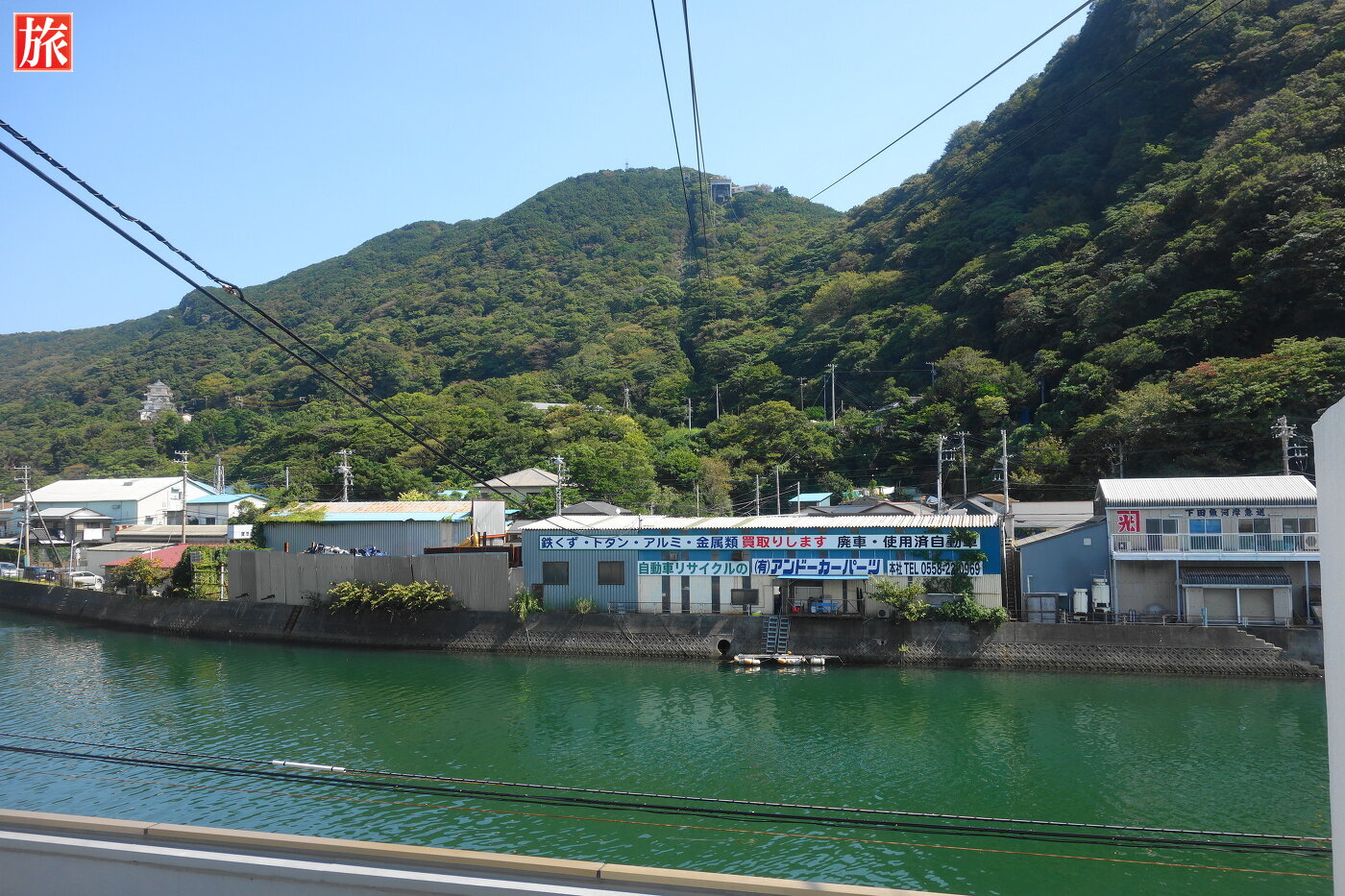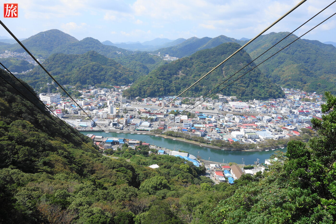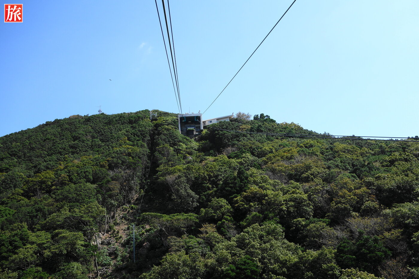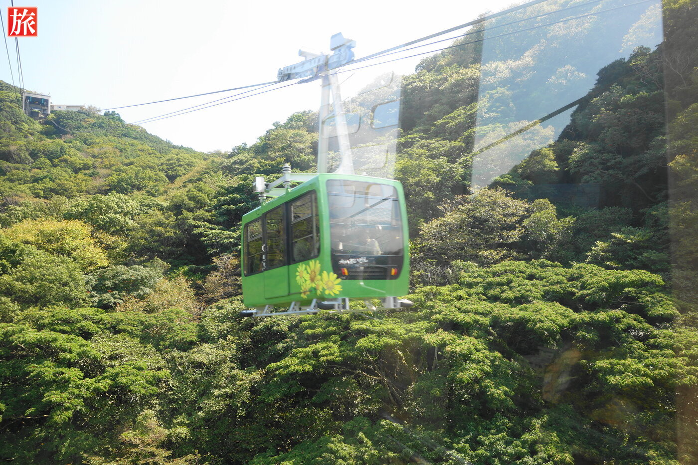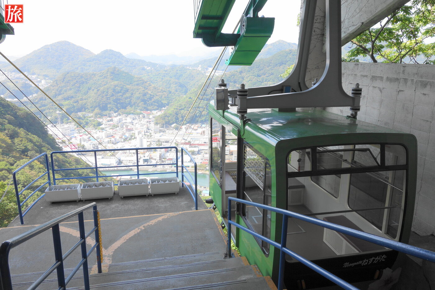 ロープウェイ「あいぜん」とすれ違い。中間あたりから見た山頂方向。下田市街の風景。ロープウェイ内。