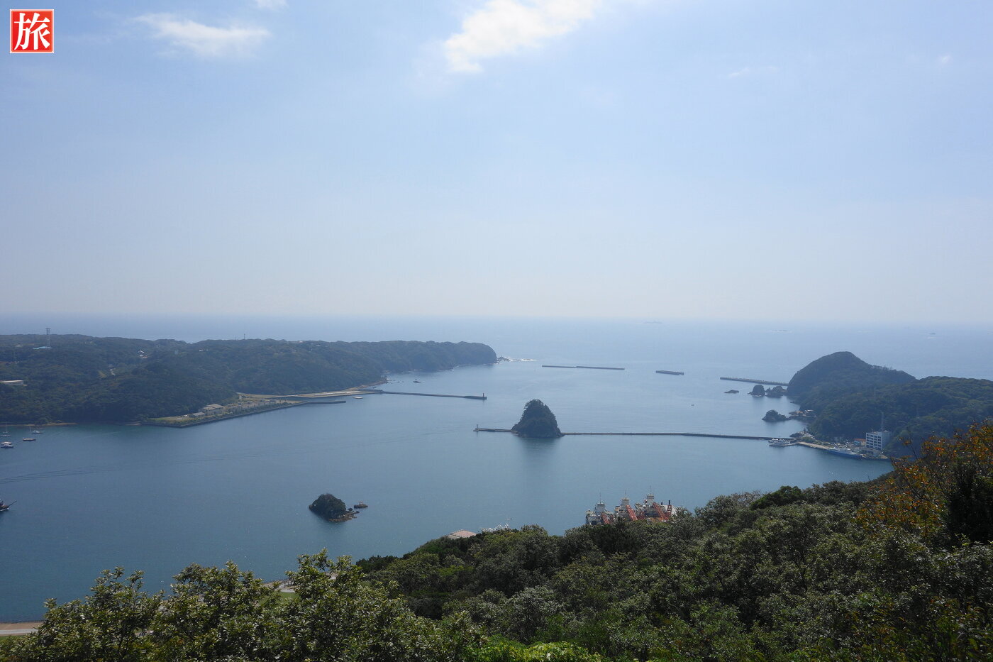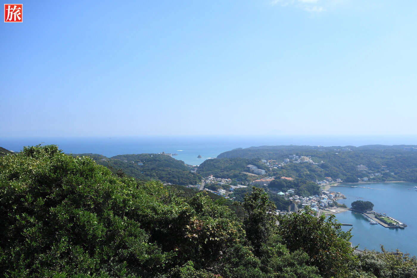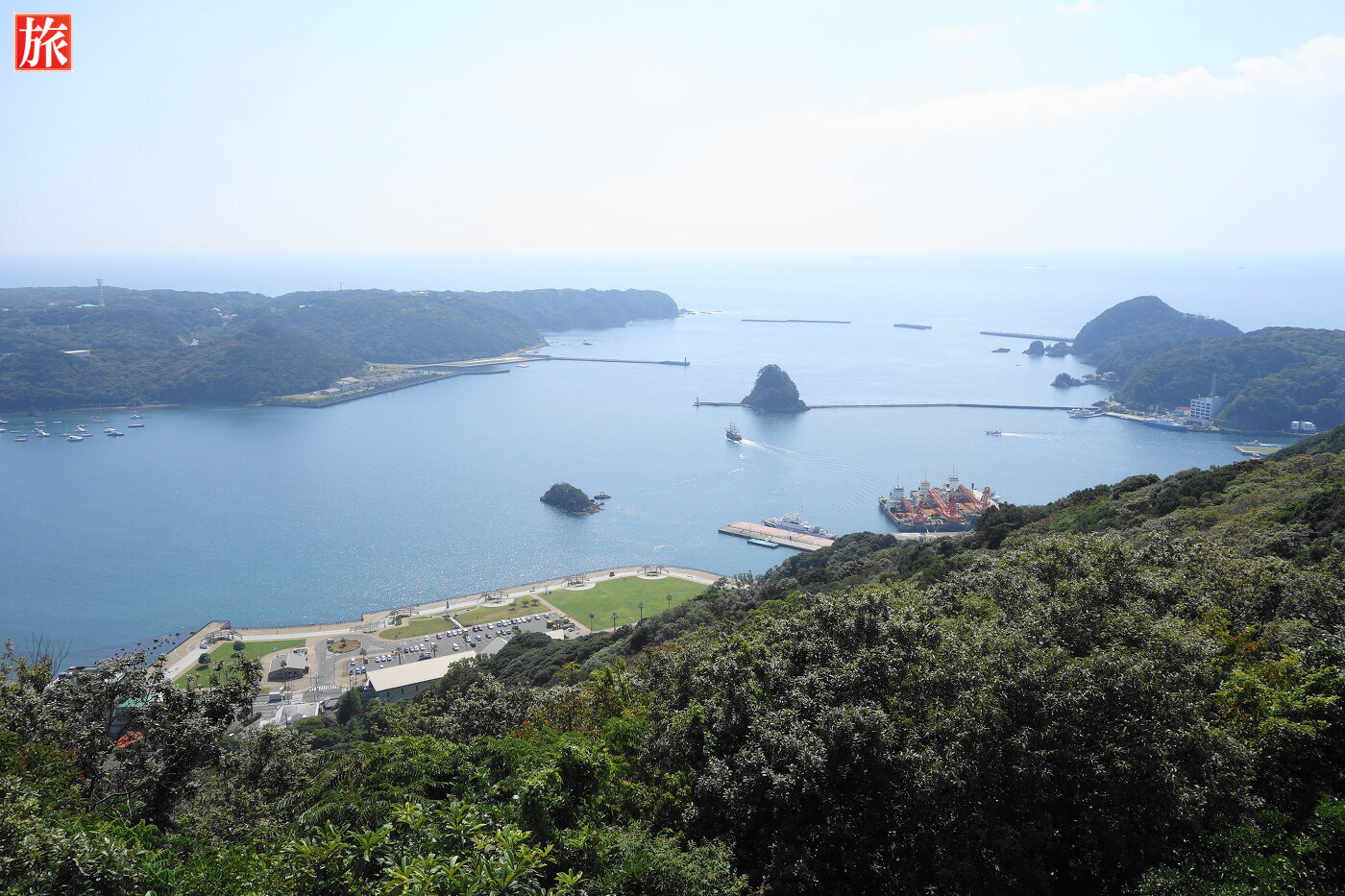 寝姿展望台。寝姿展望台から眺めた爪木崎、下田港の風景。