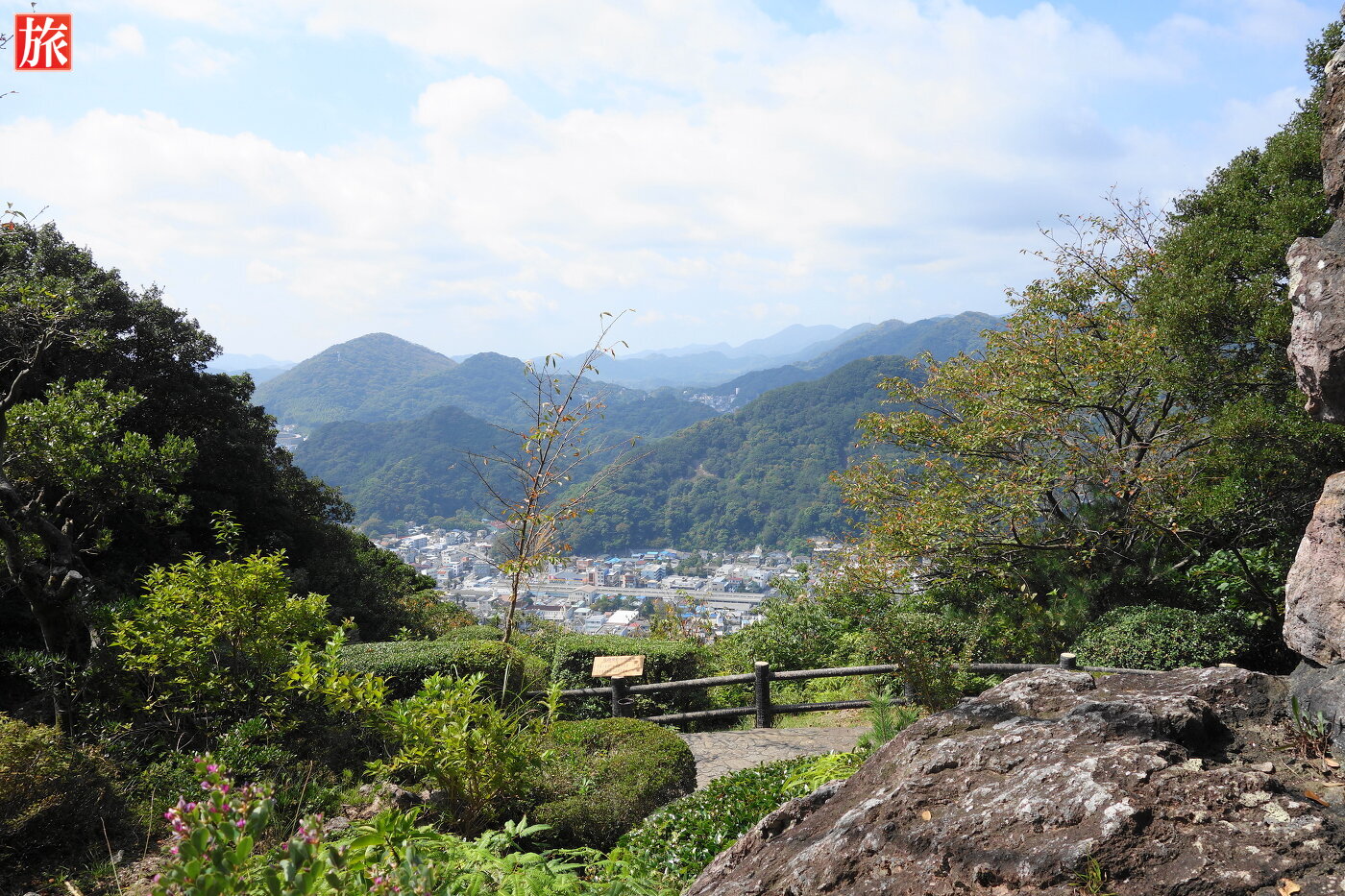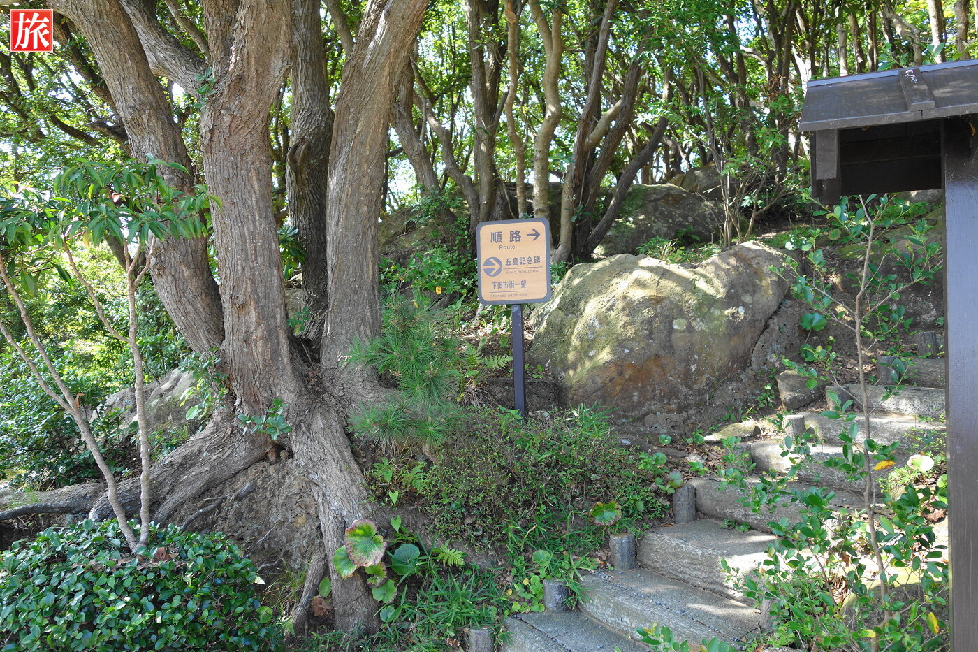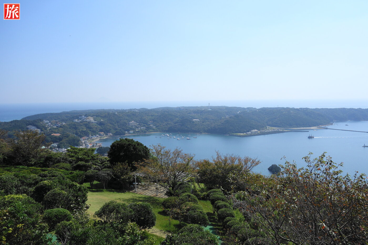 寝姿山駅から愛染明王堂へ続く遊歩道。黒船展望台に着きました。黒船展望台から眺めた下田湾の風景。爪木崎方向の風景。