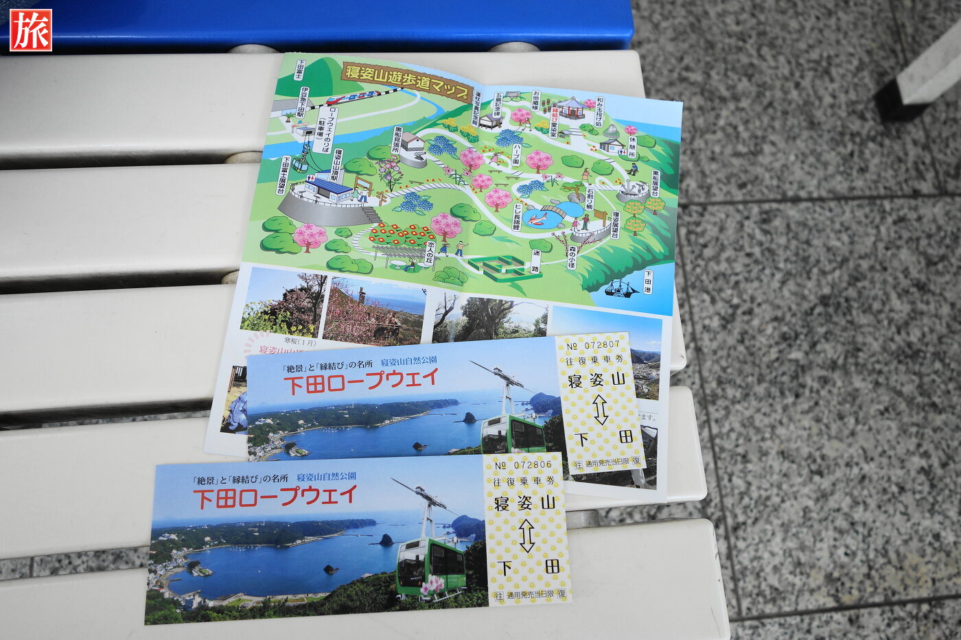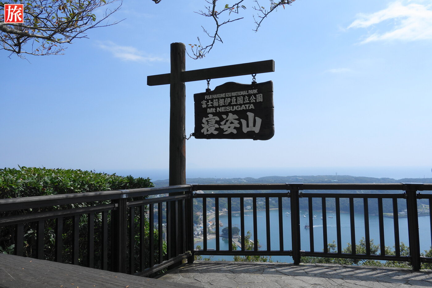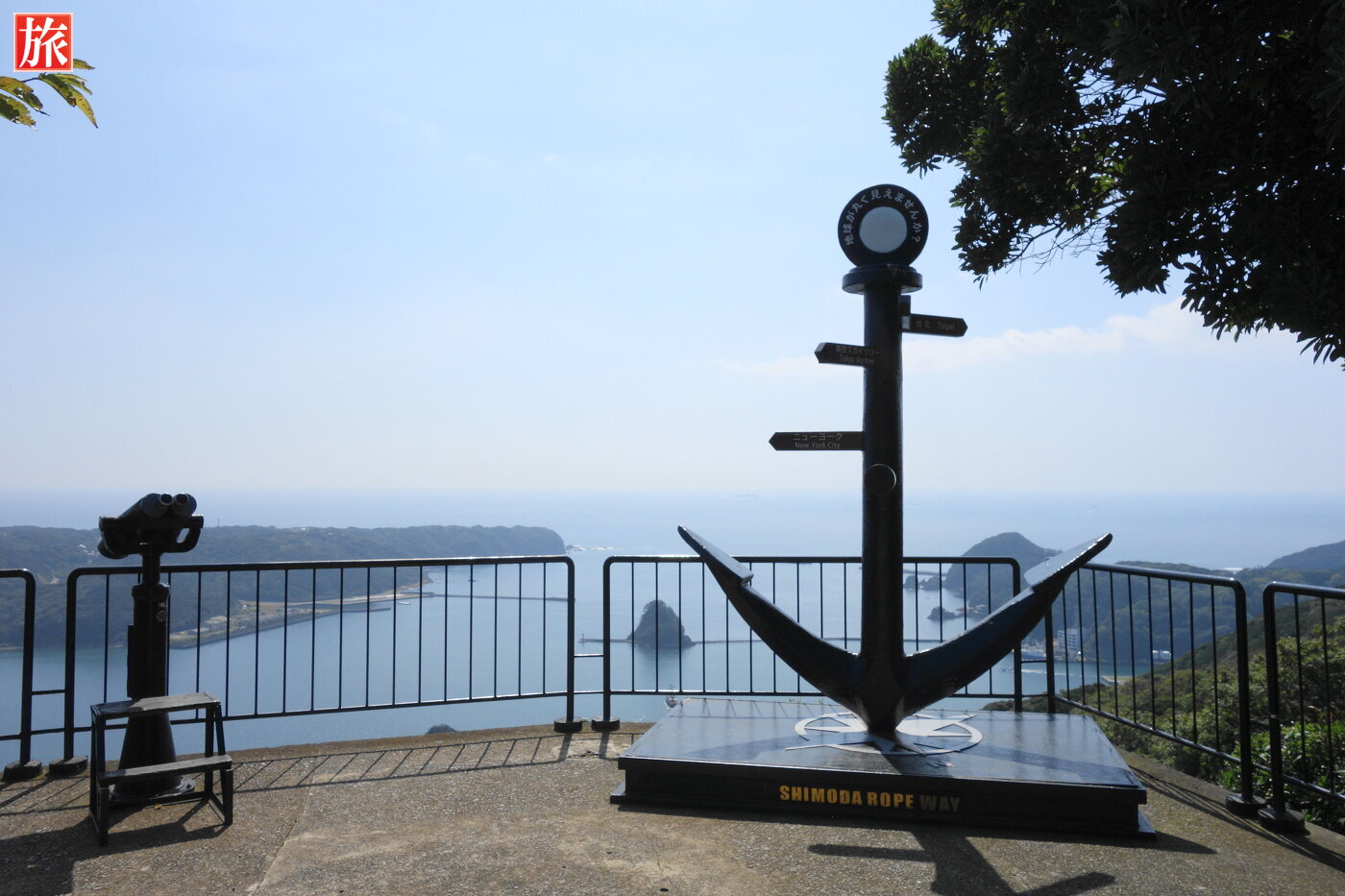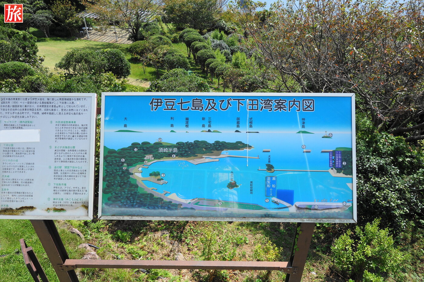 寝姿山駅付近から下田港を眺めた風景。御用邸のある爪木崎方向の風景。伊豆七島および下田湾の案内図。