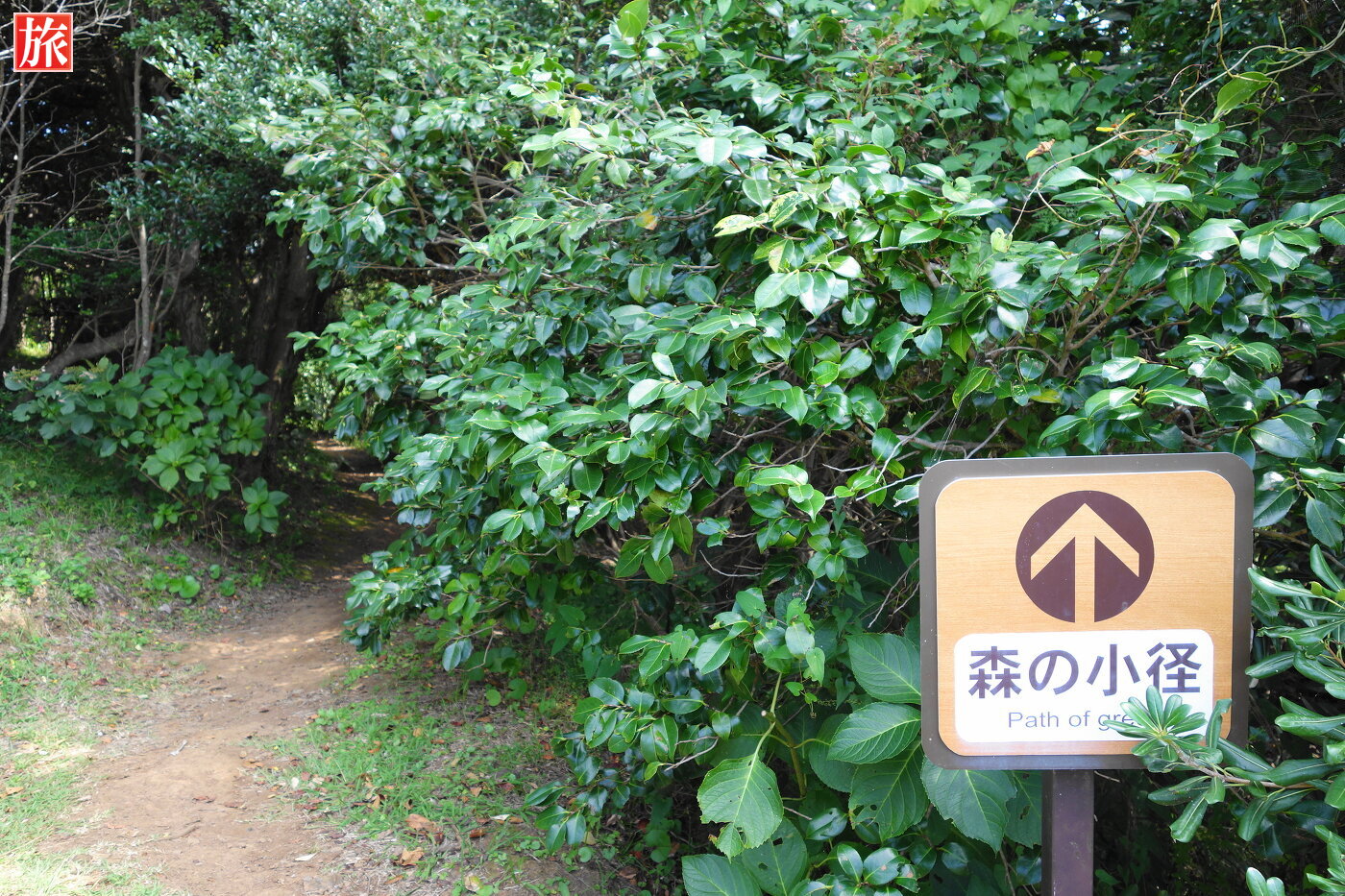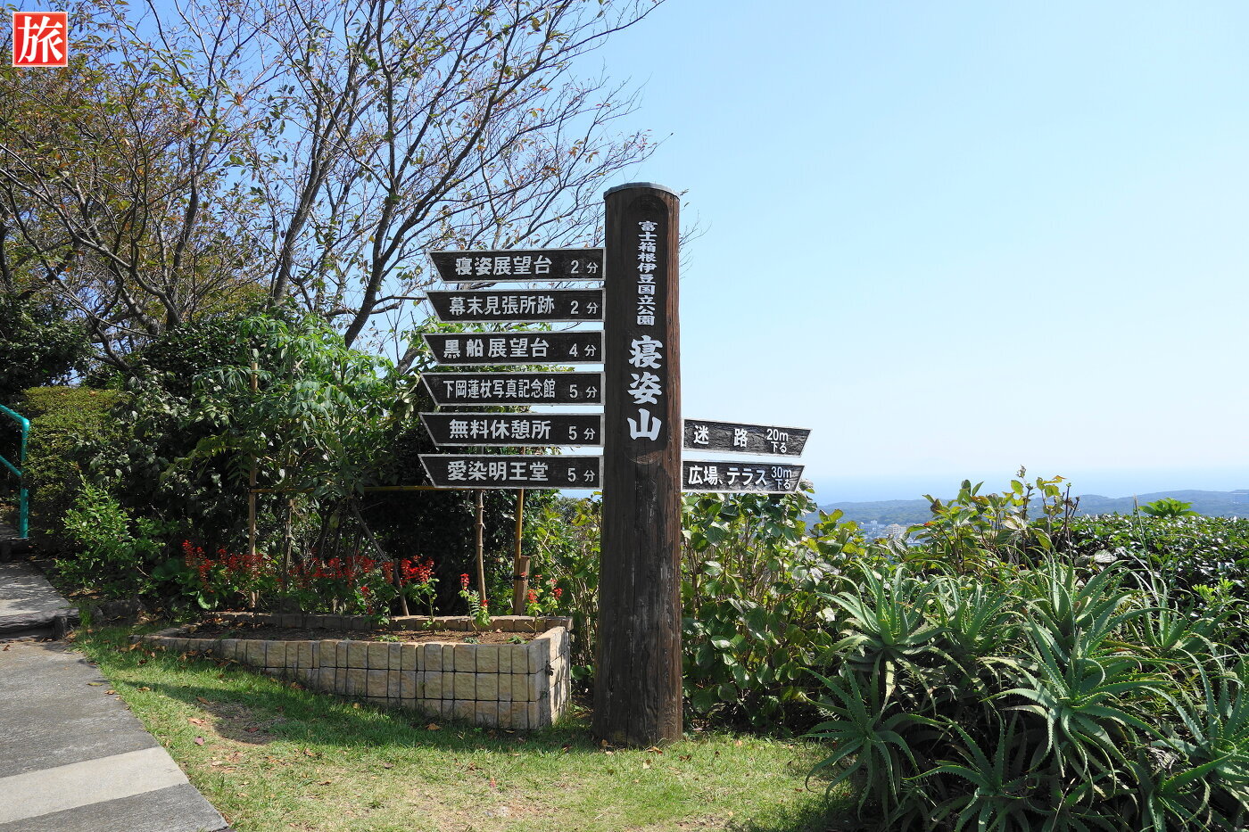 寝姿山の道標。広場・テラス方向から森の小径を経由し黒船展望台へ向かいます。