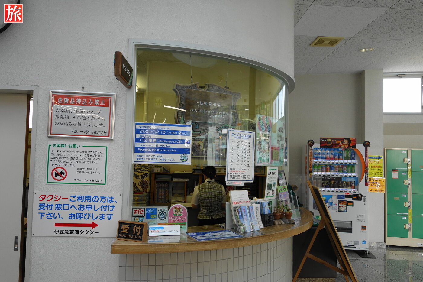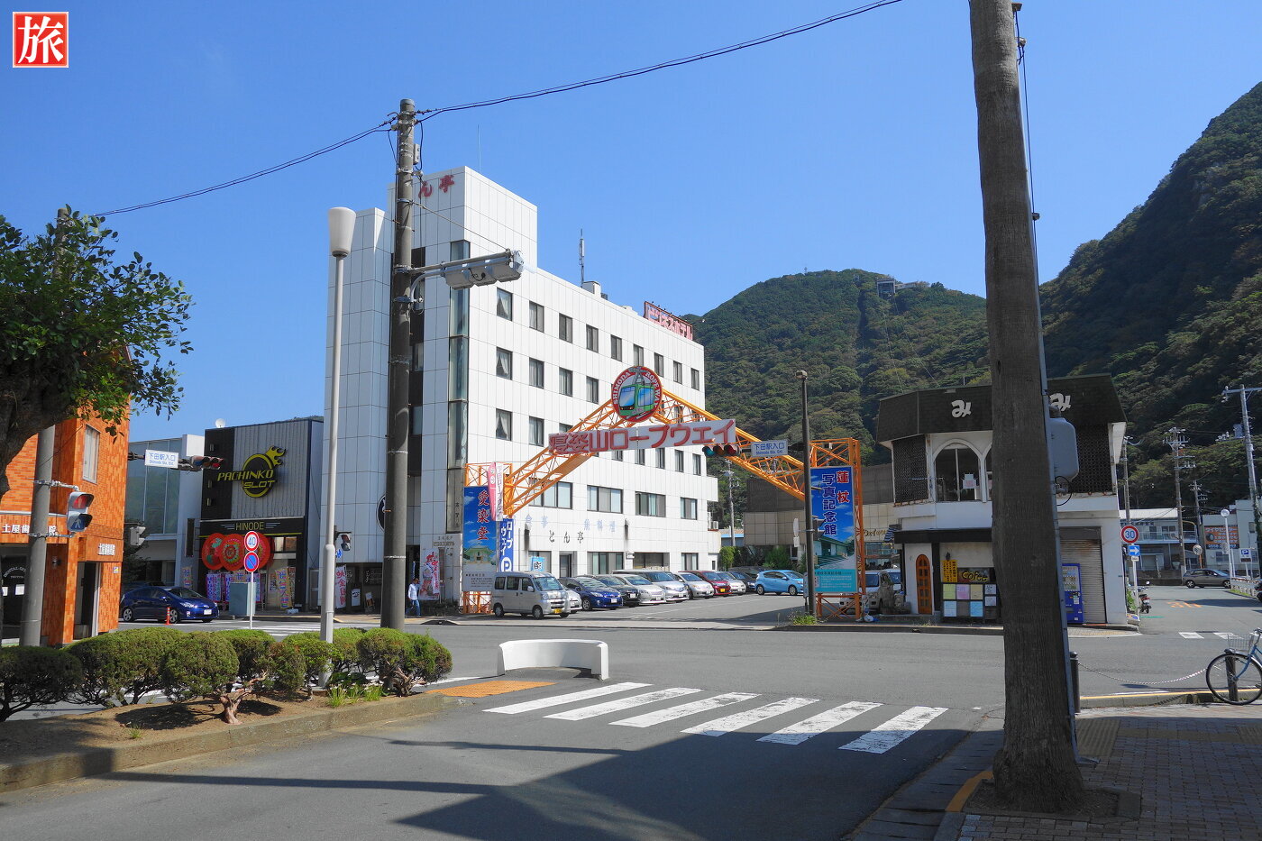 下田駅入口の交差点に寝姿山ロープウェイ入口があります。寝姿山ロープウェイのりば付近。乗車券売り場。お土産も販売。