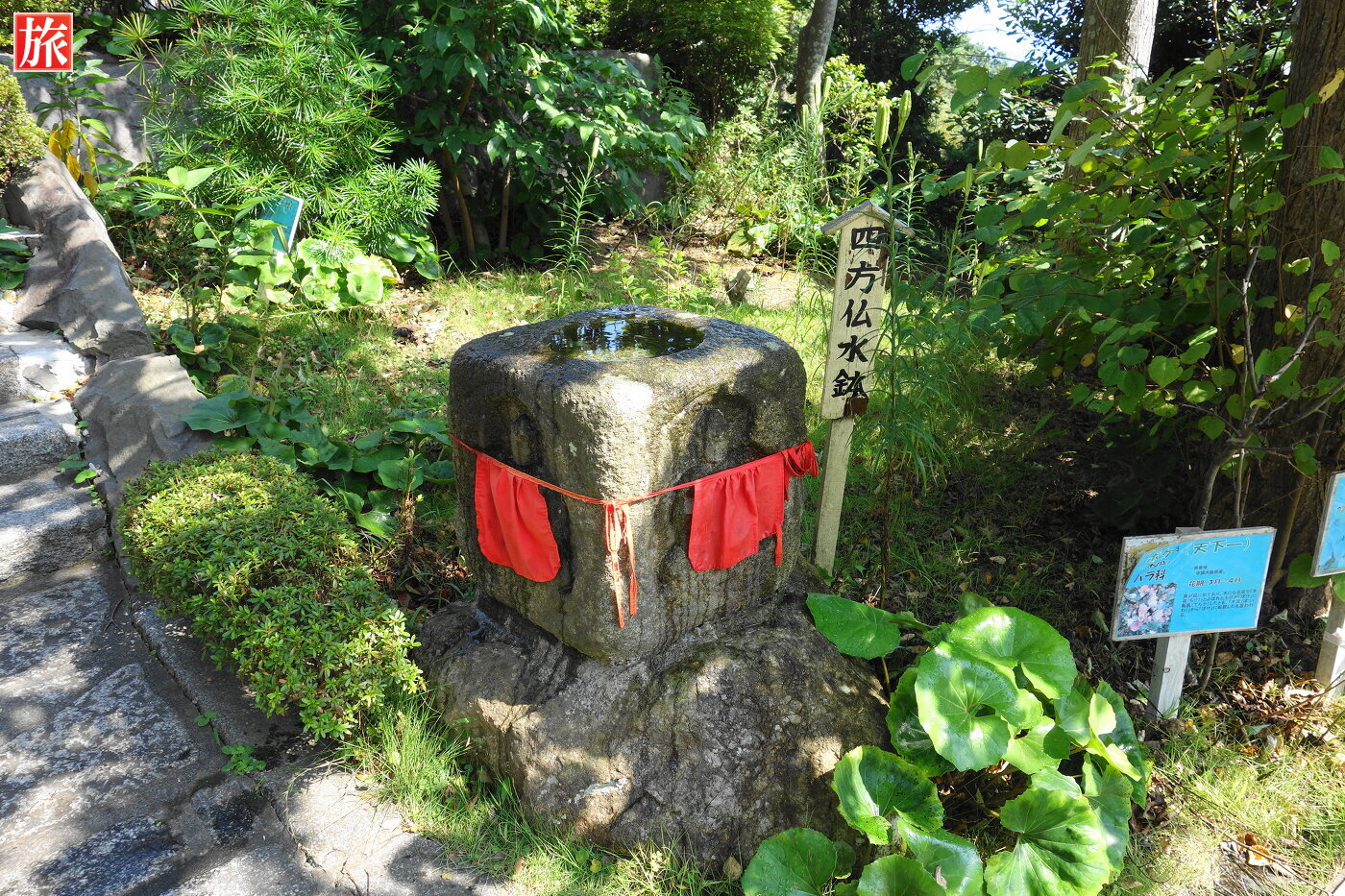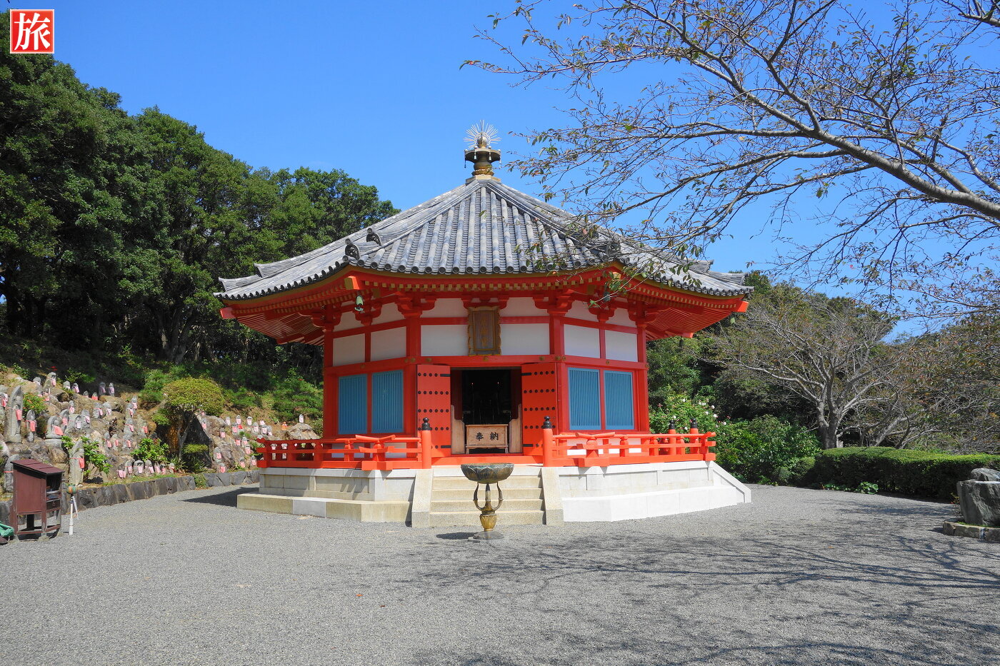 四方仏水鉢。縁結びの名所でパワースポットの愛染明王堂。 愛染堂(昭和47年建立)は奈良法隆寺の夢殿を3分の2の大きさに再現したものです。ご本尊は、良縁や縁結び、子宝、安産など特に女性に肝要の愛染明王さまです。