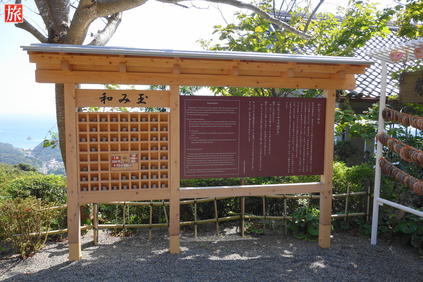 粘土製の「和み玉」、和み玉4つで200円。和(なご)み玉を二つの交わった輪に通し、先にある岩に当ると「和」がさらに深まると言われています。