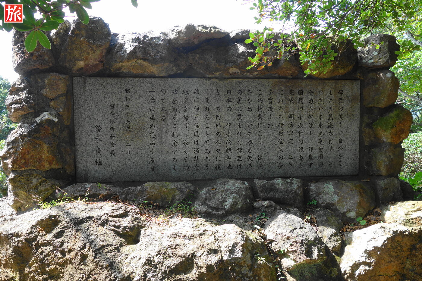 愛染明王堂建立縁起。五島記念碑方向進みます。寝姿山の山頂の建立されています 「五島記念碑」 。五島慶太翁は、率いる東急事業団の全力を傾注し、伊東-下田間46Kmの鉄道を完成させた人物。下田市街を眺めた様子。