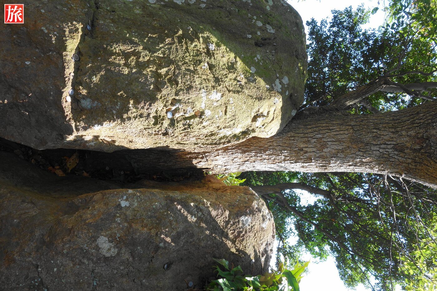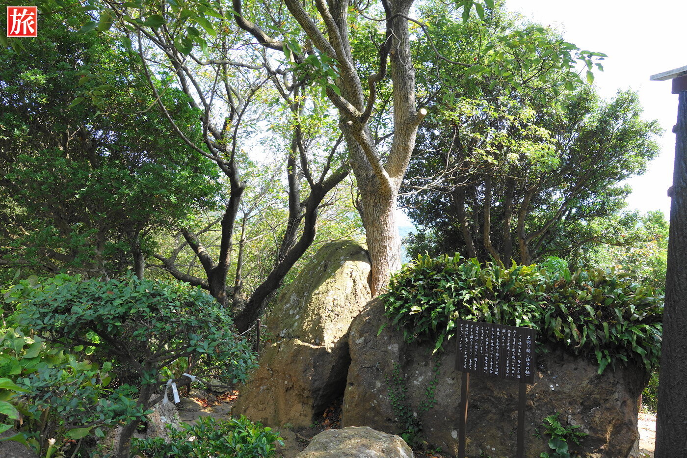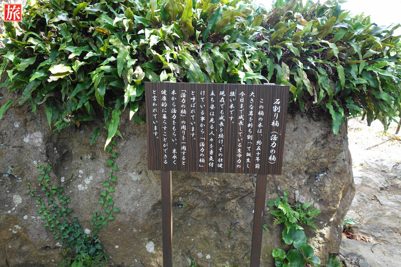 また中腹から山頂に至る途上には「石割楠」があり、難関突破のパワースポットと言われている。2メートル近い巨石を真っ二つにして楠がはえている。