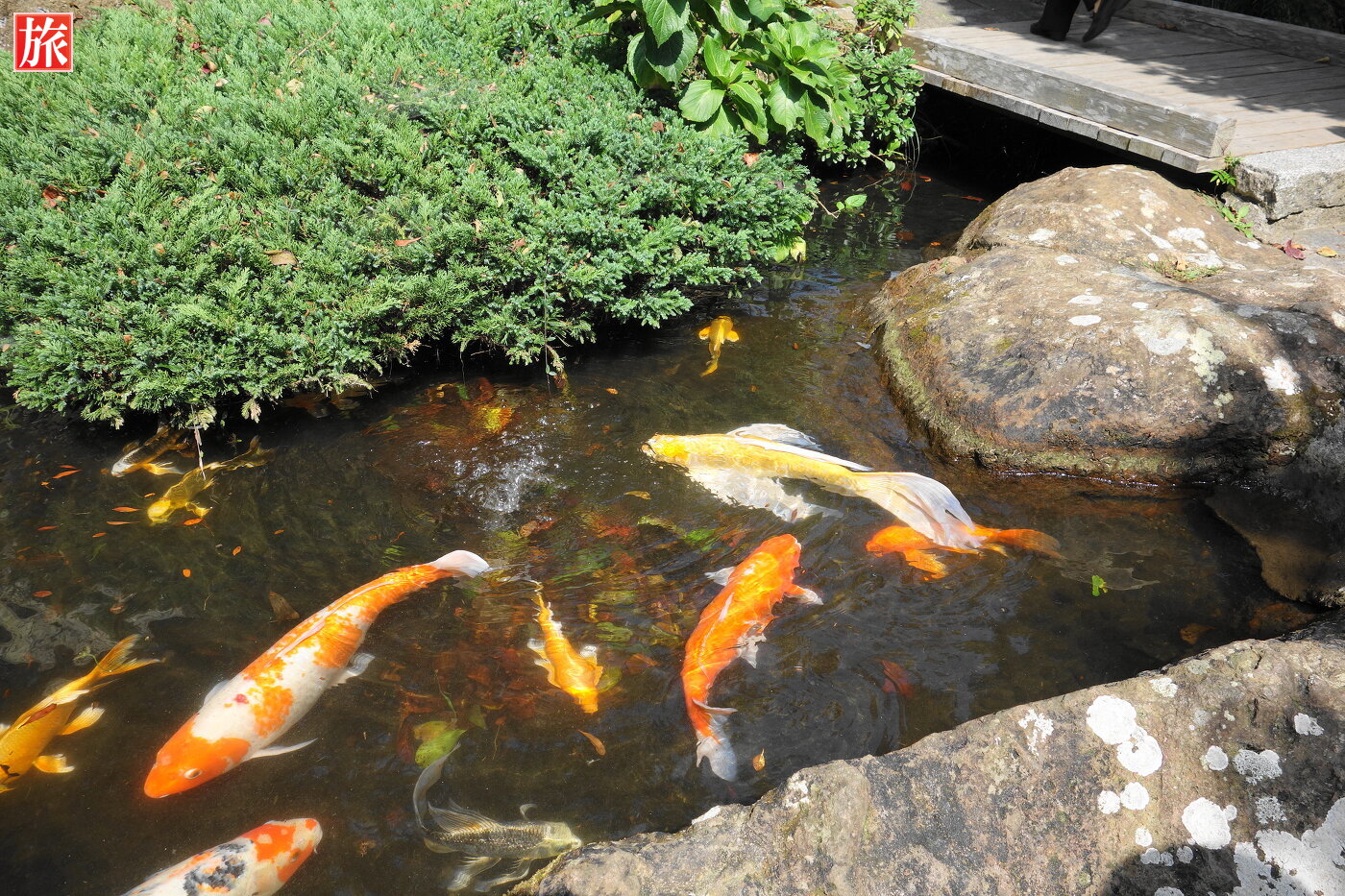 約50年前に大きな岩を割って誕生し、成長を続けている楠(くすのき)。石割楠(いしわりくすのき)の説明。石割楠、難関突破の合格祈願で知られるスポット。ひょうたん池に泳ぐ、国内にも数箇所しかいない「ヒレ長錦鯉」(ヒレナガ・ニシキゴイ)。