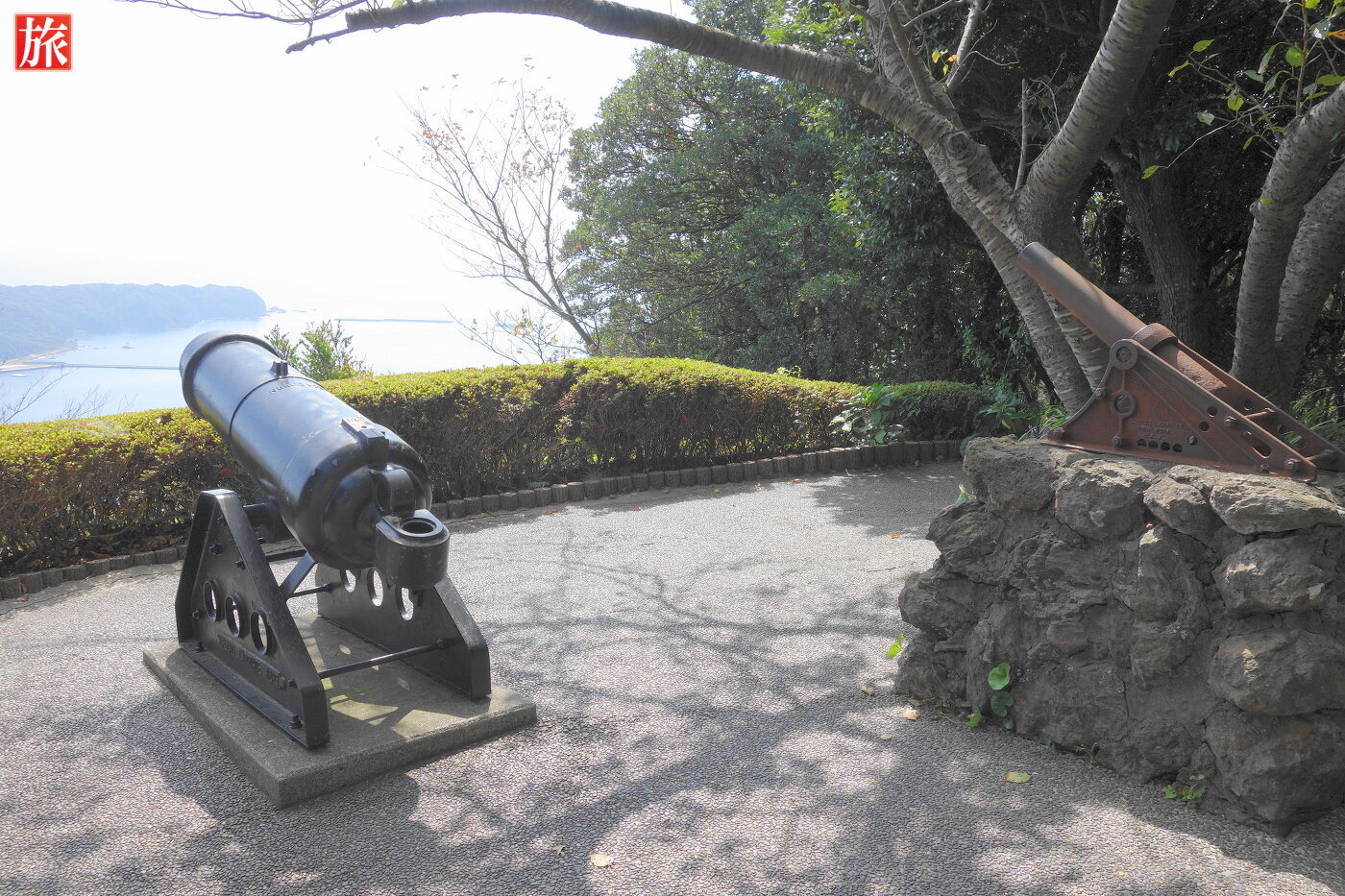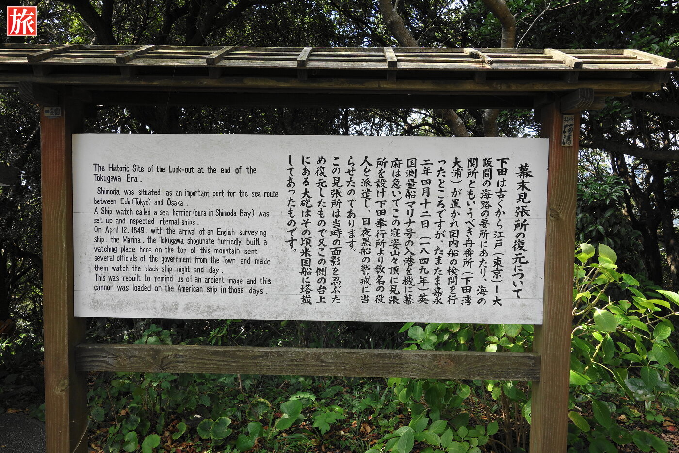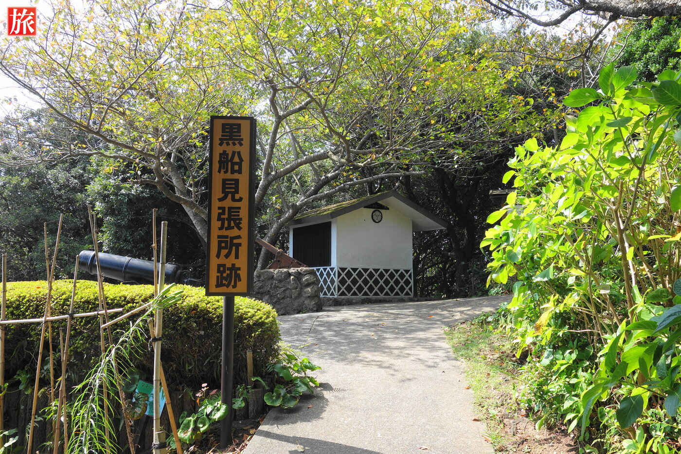 黒船見張所跡。幕末見張小屋が復元されています。黒い大砲が設置されています。※この大砲は、当時のアメリカ船に設置されていたものとのことです。幕末見張所の説明。