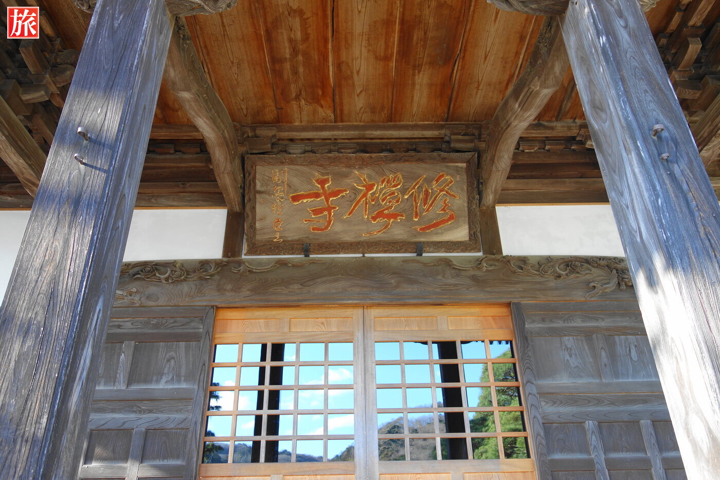 本堂に架かる扁額。本堂から境内を振り返った様子。