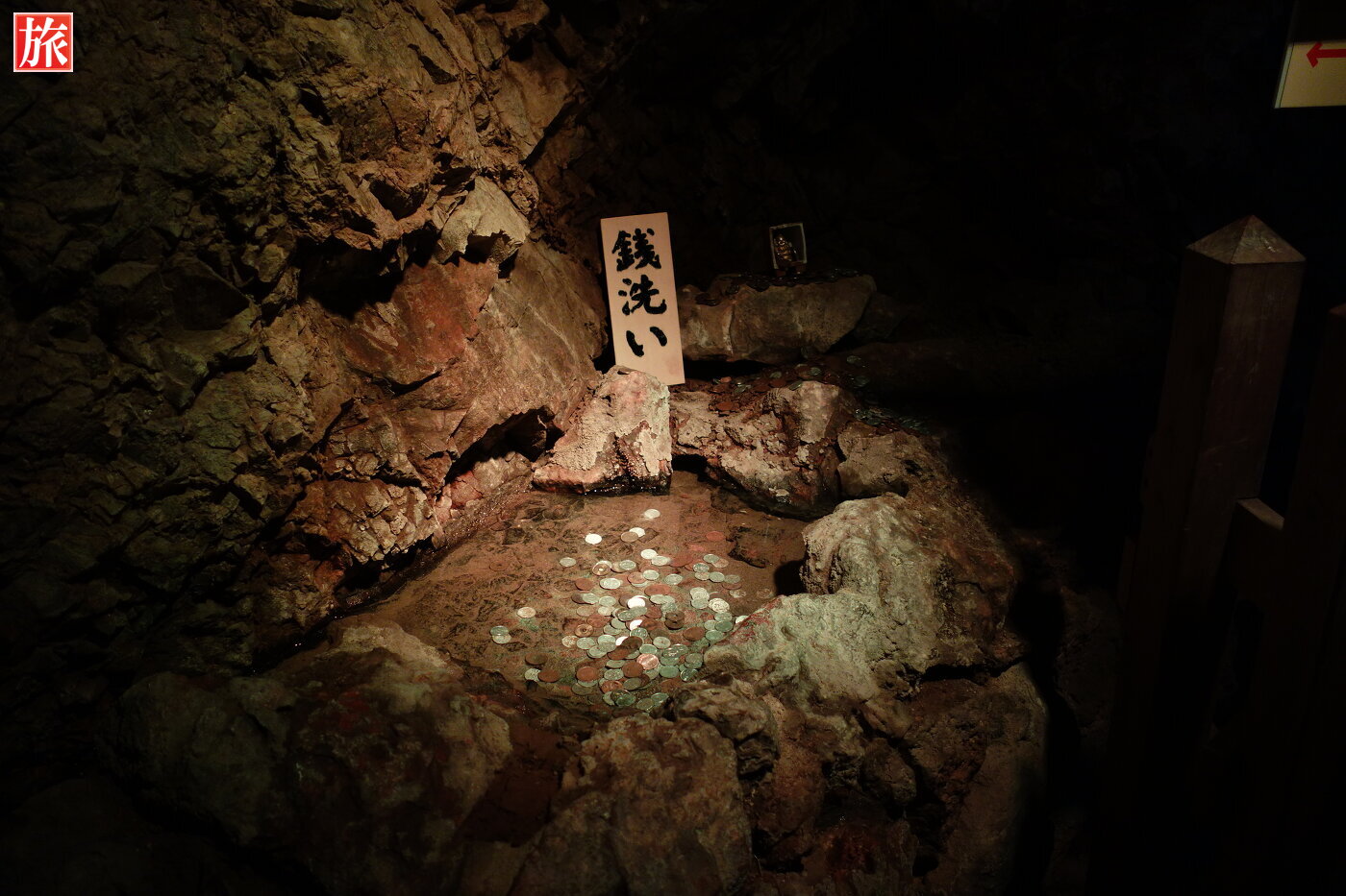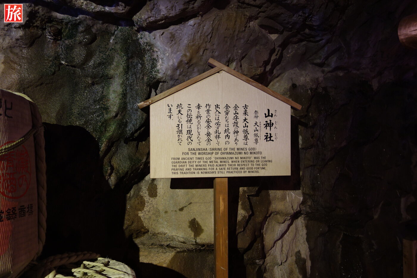 観光坑道を入ってしばらく歩いた突き当たりに「山神社(さんじんじゃ)」があります。ご祭神は大山祇尊(おおやまずみのみこと)で山の神様です。全部金箔で覆われている鳥居が目印。坑内に出入りする際に、礼拝して作業の安全と黄金の幸を祈るしきたりがあったそうです。金運がアップするパワースポットだと言われています。