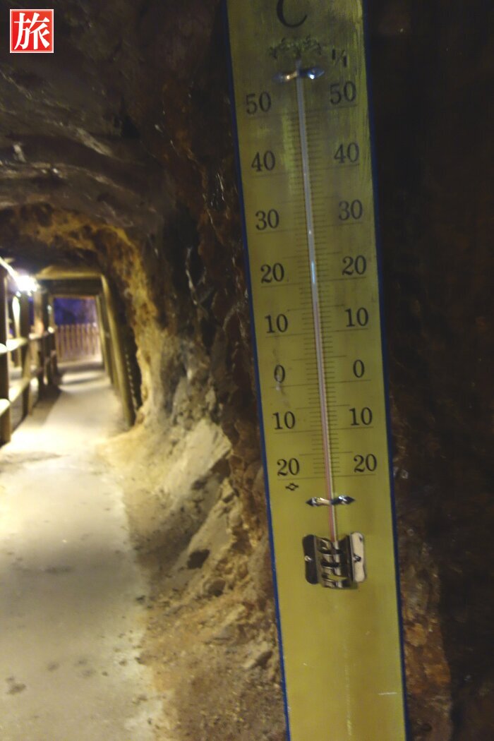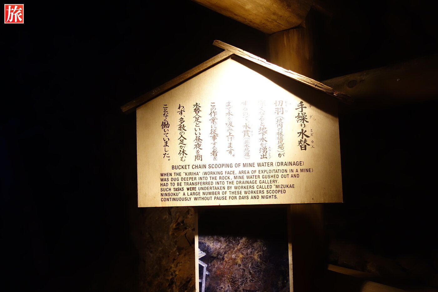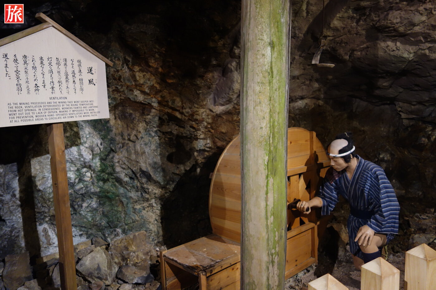 坑道内の気温は年間を通して約19度-22度で冬は暖かく夏は涼しく感じられるようです。手繰り水替の様子。湧き出た地下水を昼夜を問わず休み無く汲み上げていたそうです。