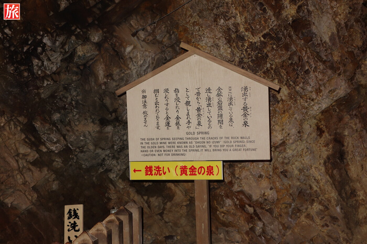 銭洗(黄金の泉)。「湧出する黄金の泉」の説明。江戸時代の採掘の様子を見学することができます。