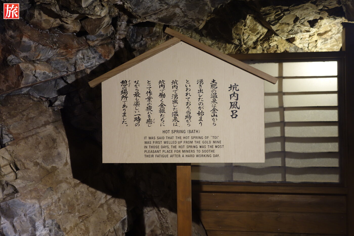 採掘の様子。坑道の様子。湧き出た温泉を利用したお風呂を再現。坑内風呂の説明。