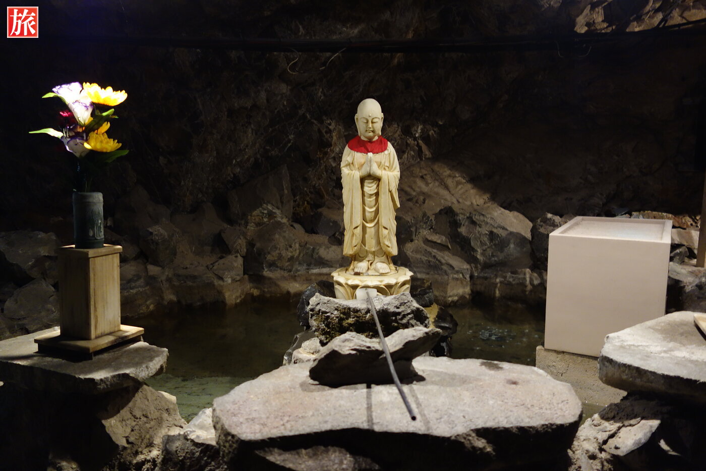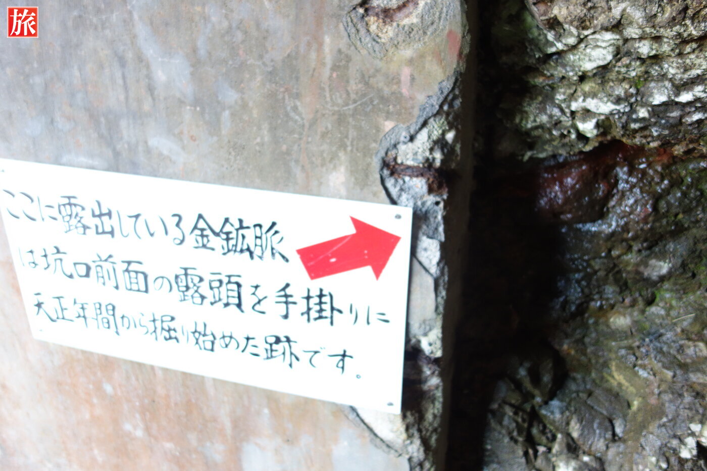 金子地蔵尊とその説明。坑道の出口付近に金鉱脈を掘り始めた跡が残っています。