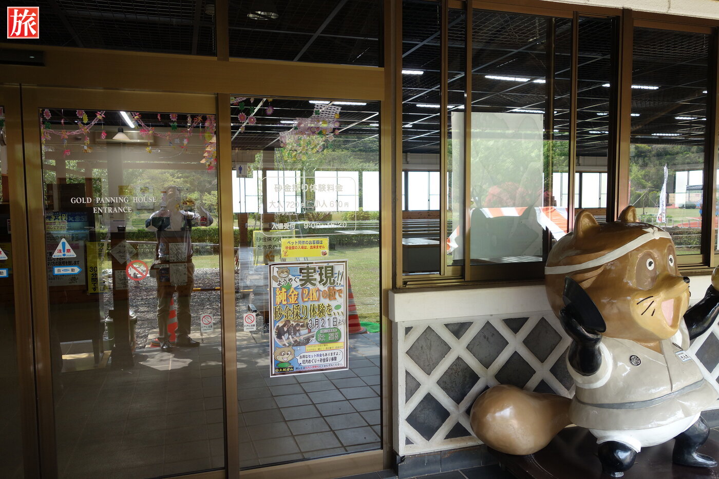 入口では狸砂がお出迎え!30分以内採り放題の砂金採り体験ができます。