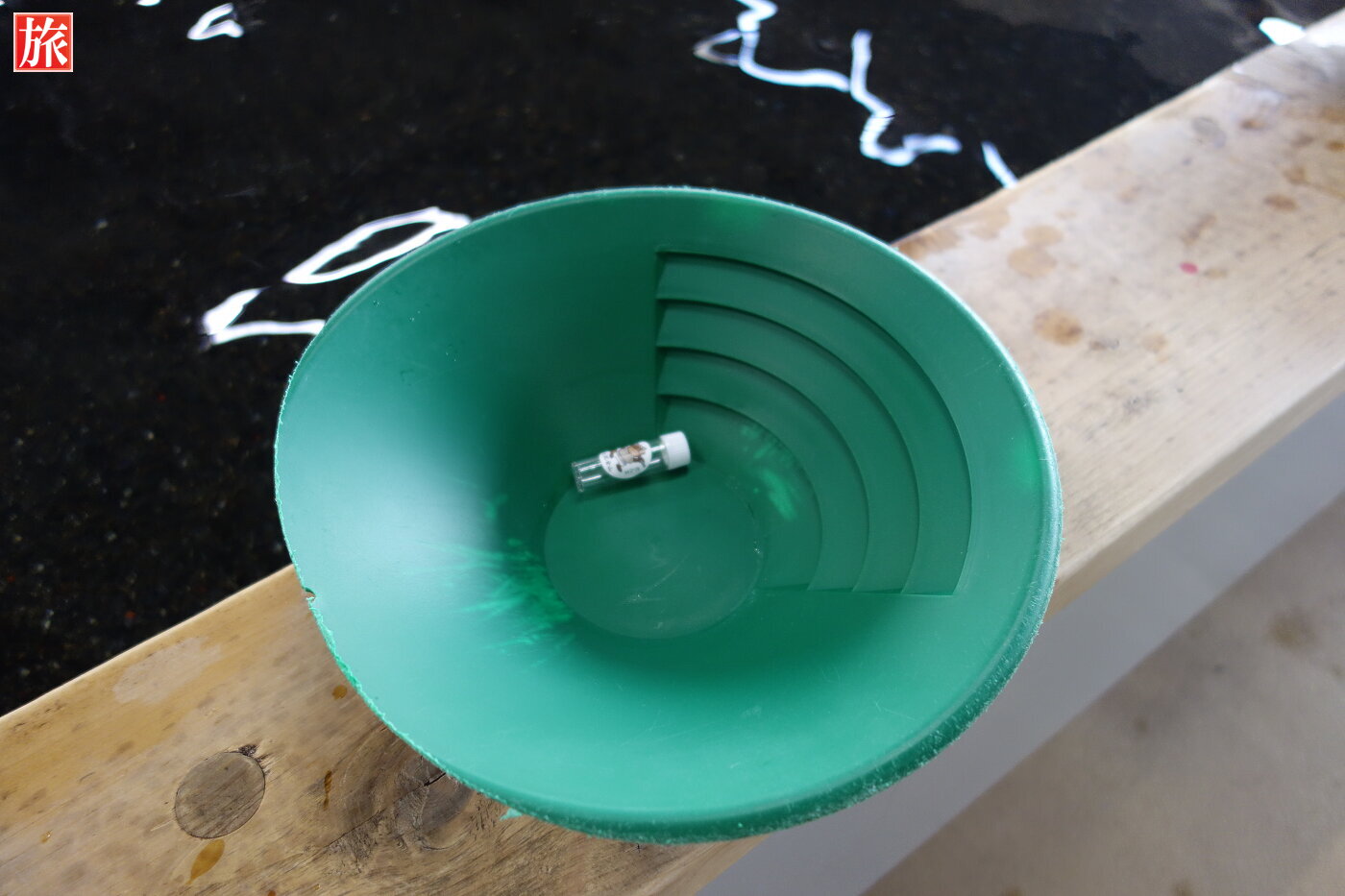 砂金採りは、大きな温泉が入った水槽に皿を入れ砂をすくい、温水の中で皿を回して余分な砂を流すと最後に段になった所に砂金が残る...という感じで採ります。取れた砂金(体験料金に含む)は小さなボトル(体験料金に含む)に入れキーホルダーやペンダント(有料1000円程度)に加工できます。
