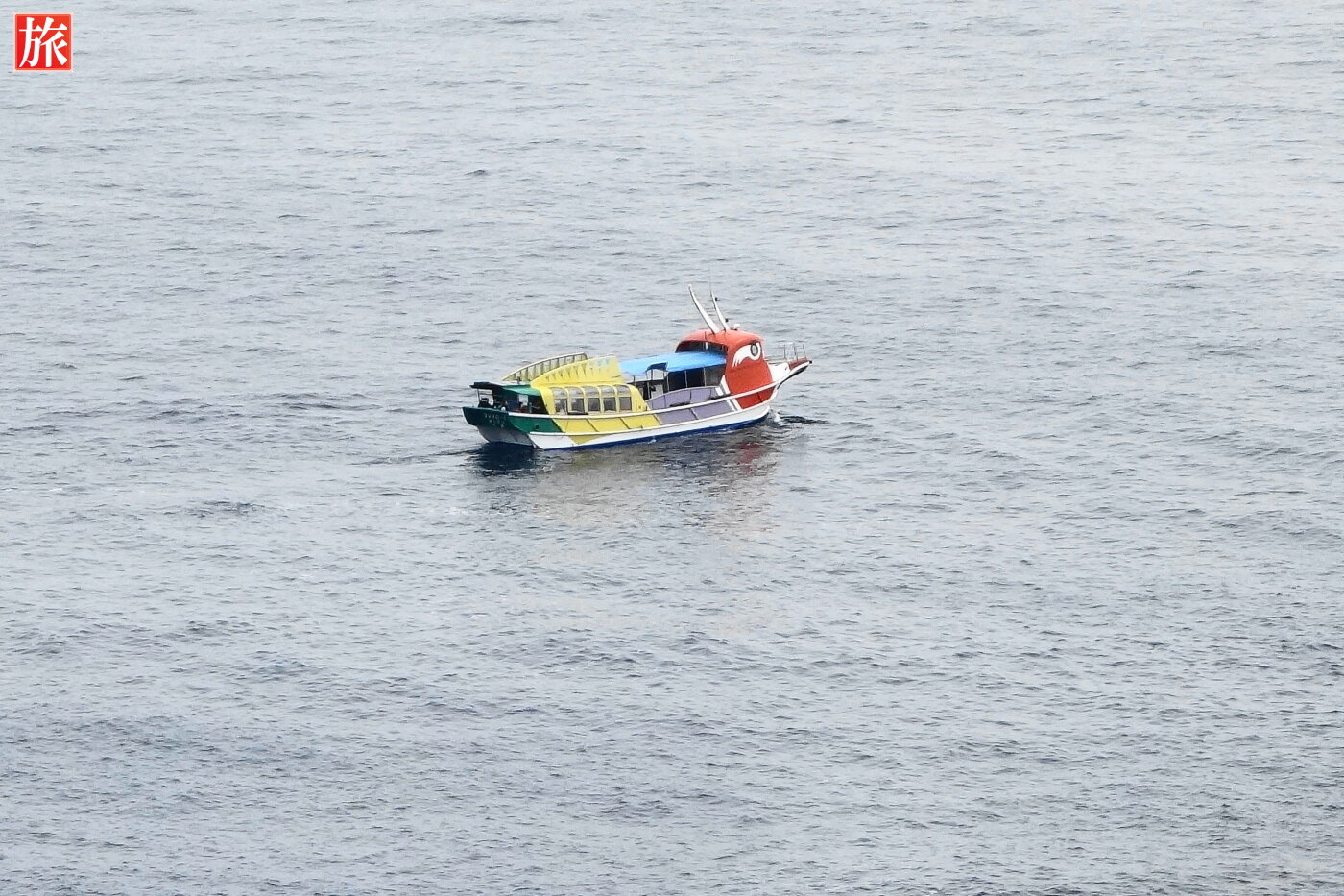 漁港にある遊覧船乗り場です。坂の途中から振り返った様子。石廊崎へは500m程上り坂を登っていきます。左手に見える石廊崎漁港。