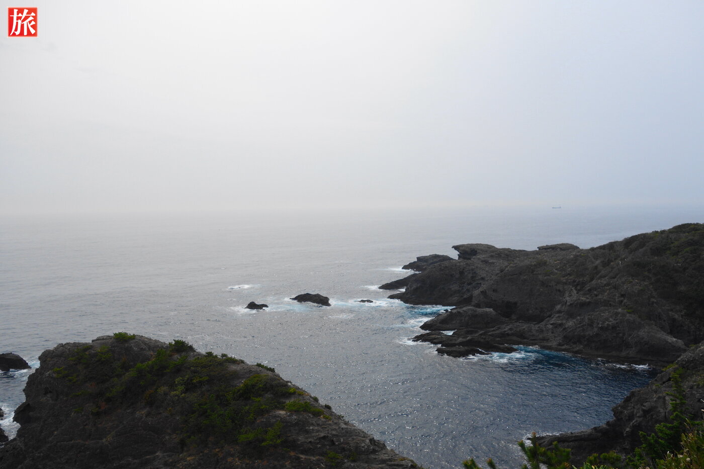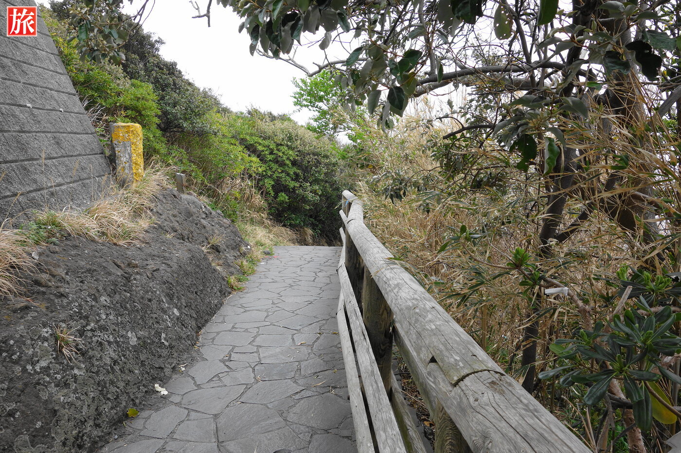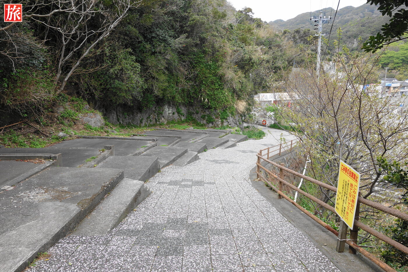 石廊埼灯台付近の石室神社参道。少し降っていきます。右手、海岸線の景色。