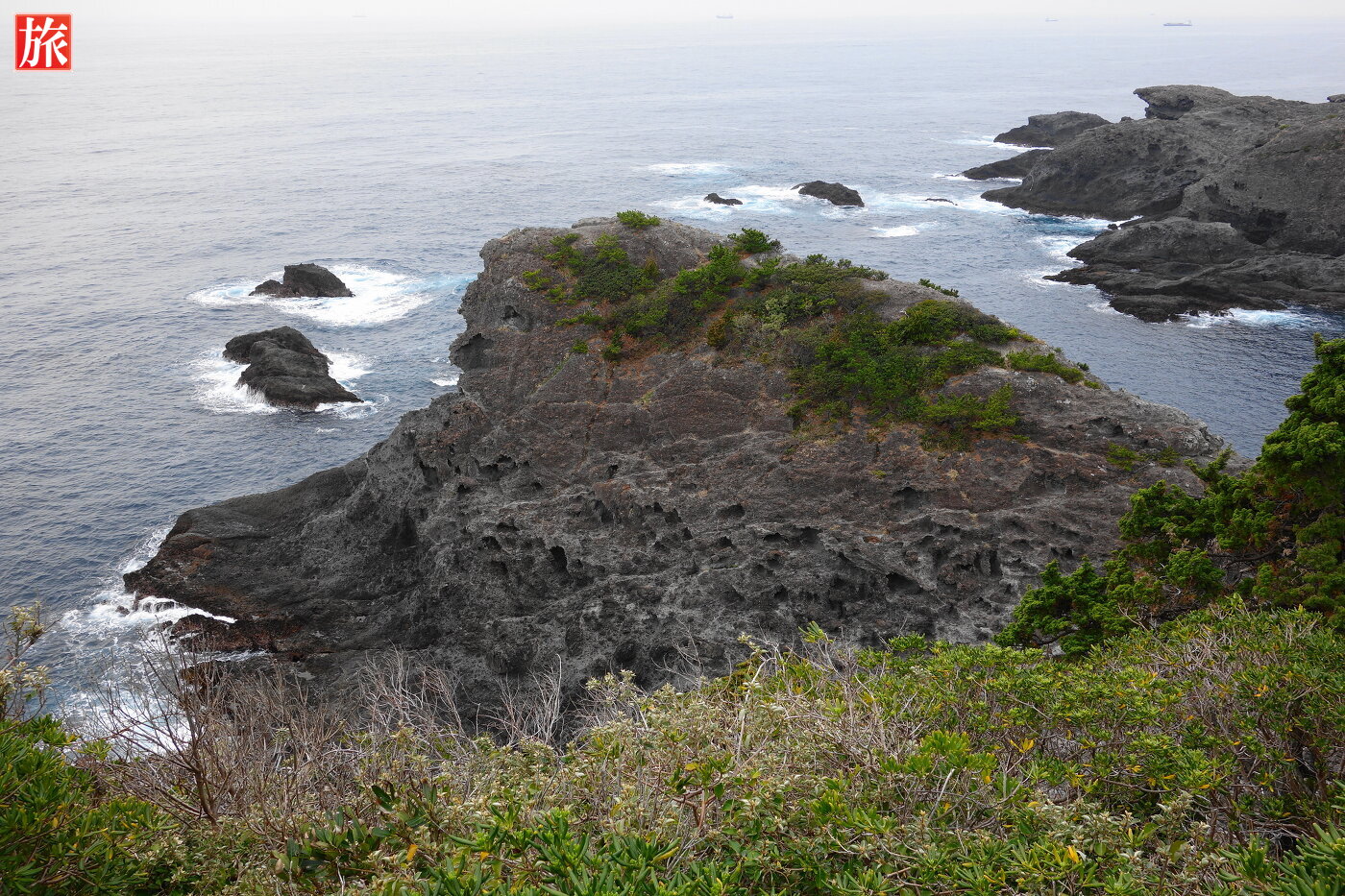 石廊崎の最南端の景色。海底火山から噴出した火山灰や溶岩からできている様子を伺えます。荒々しい岬です。