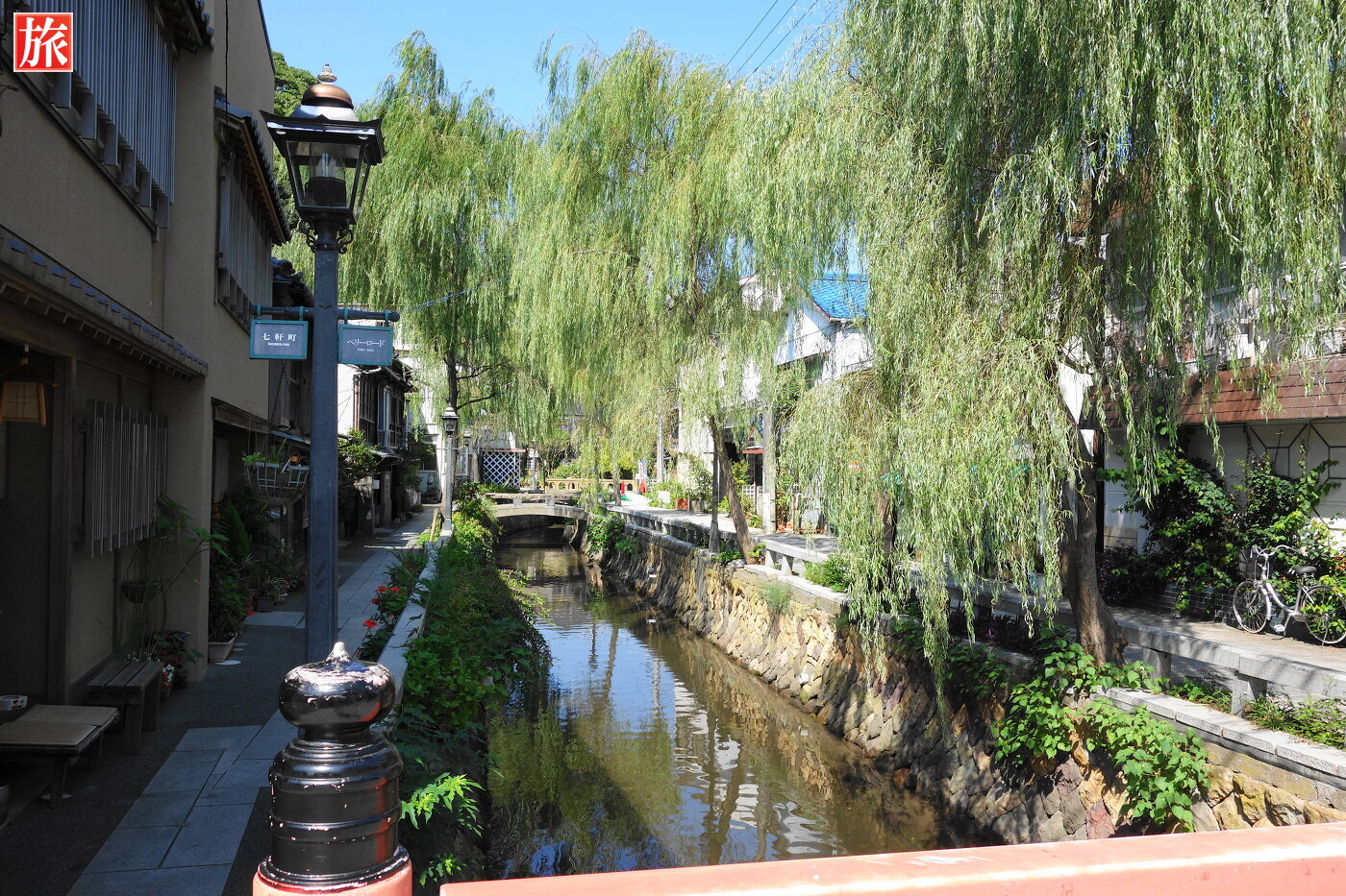 弥治川の下流から了仙寺方向を眺めた様子。弥治川にかかる柳の枝とガス灯が印象的。逢坂橋付近、右手に建物2F部には、楕円形の透明部分を残した磨りガラスの窓が特徴の草画房(カフェ&ギャラリー)が見えます。