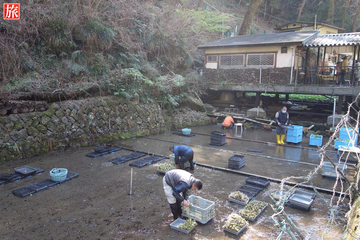 沢に沿ってワサビの栽培をしています。ワサビ収穫作業風景。マス釣り場。